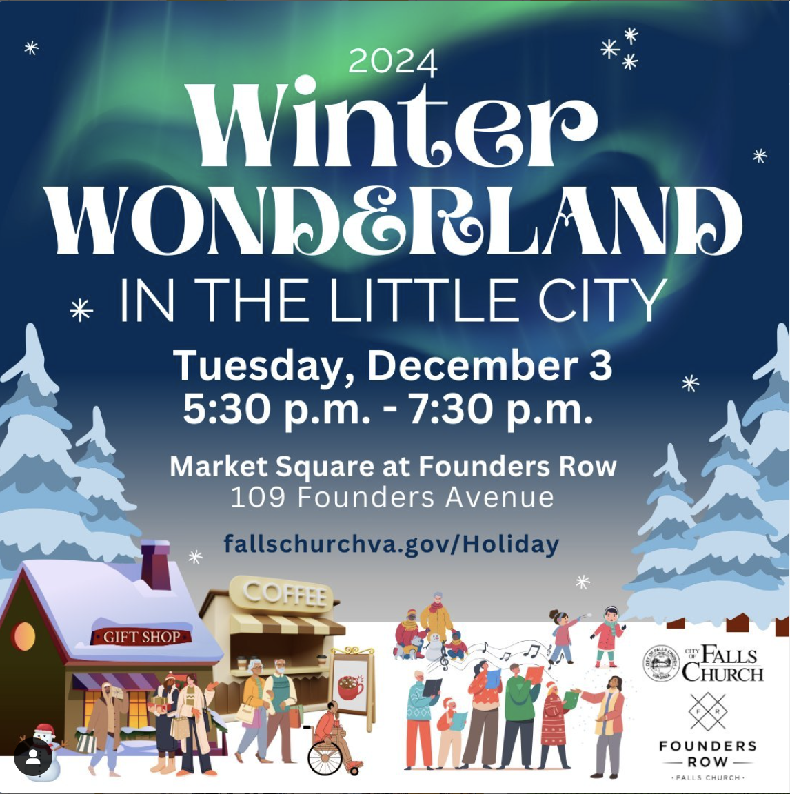 Get ready for a magical evening on Tuesday, Dec. 3, from 5:30 p.m. to 7:30 p.m. at the City of Fall Church's Winter Wonderland at Founders Row (109 Founders Avenue)! Kick off the holiday season with fun for the whole family with festive lights, music, and seasonal treats!