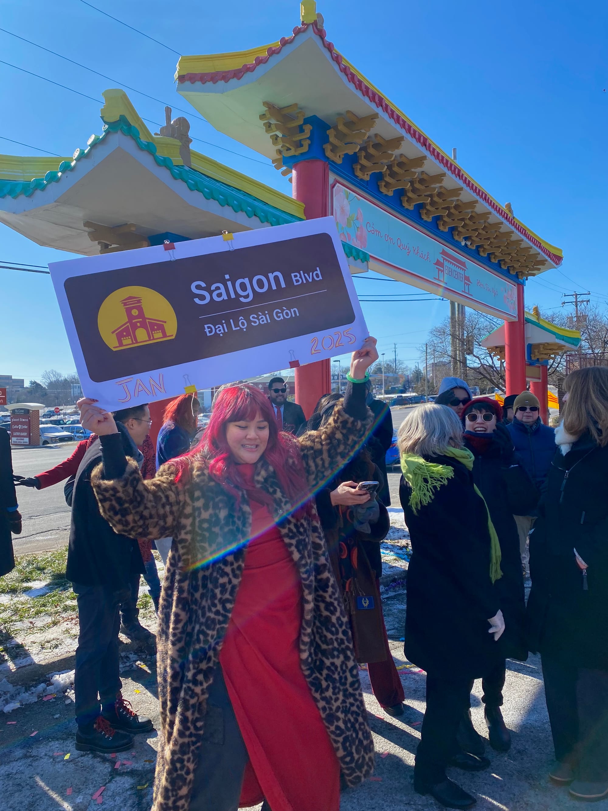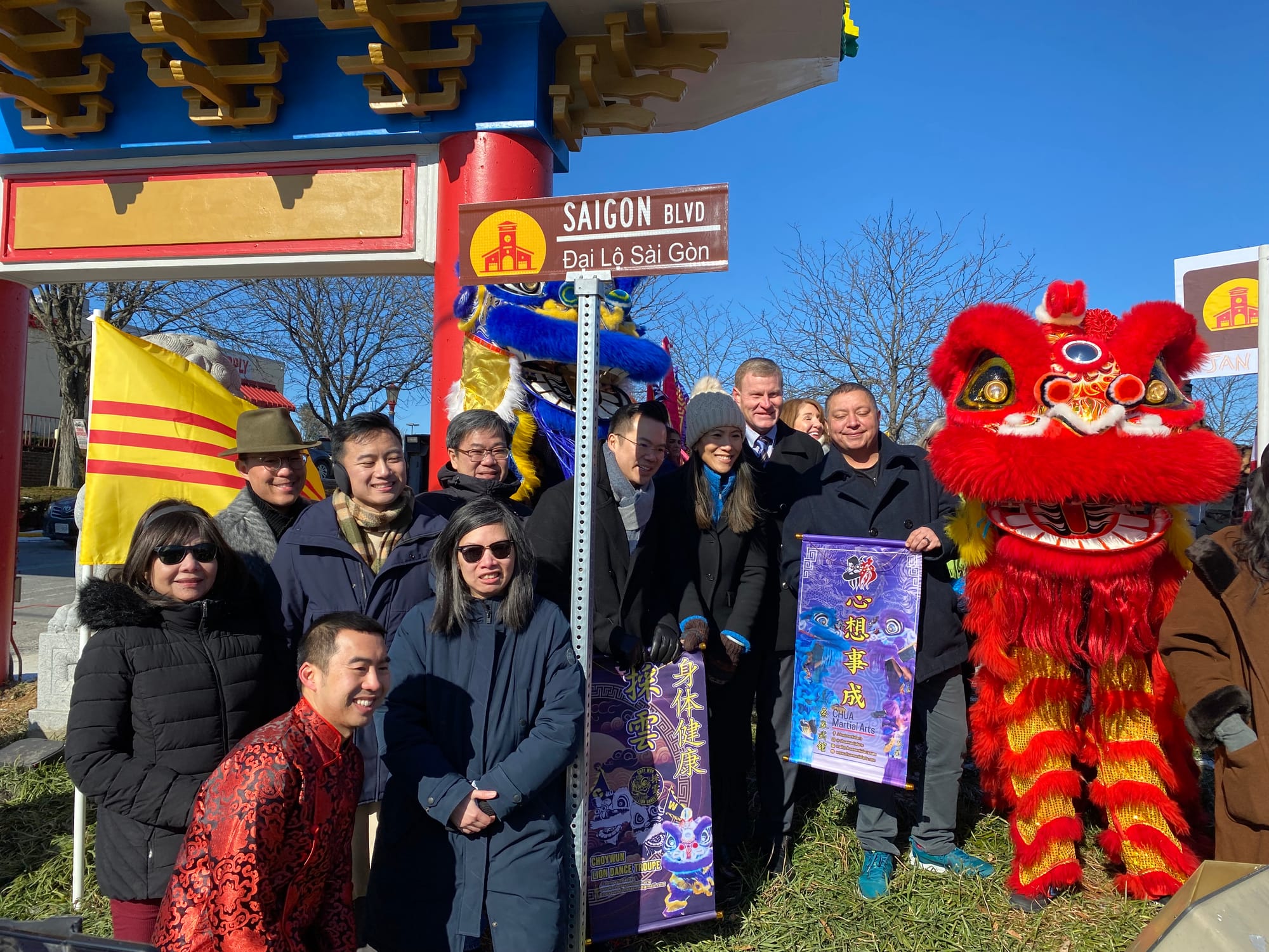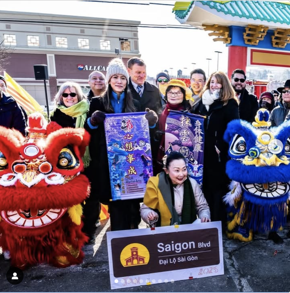 Fifty years after the fall of Saigon marking the end of the Vietnam War and just a week before the Tet Lunar New Year of the Snake, community activists from the Viet Place Collective joined federal, state, local and City officials in the frigid morning air to ceremoniously unveil to a delighted crowd three new honorary “Saigon Blvd.” street signs at Eden Center’s Lion’s Gate entrance Jan. 22.