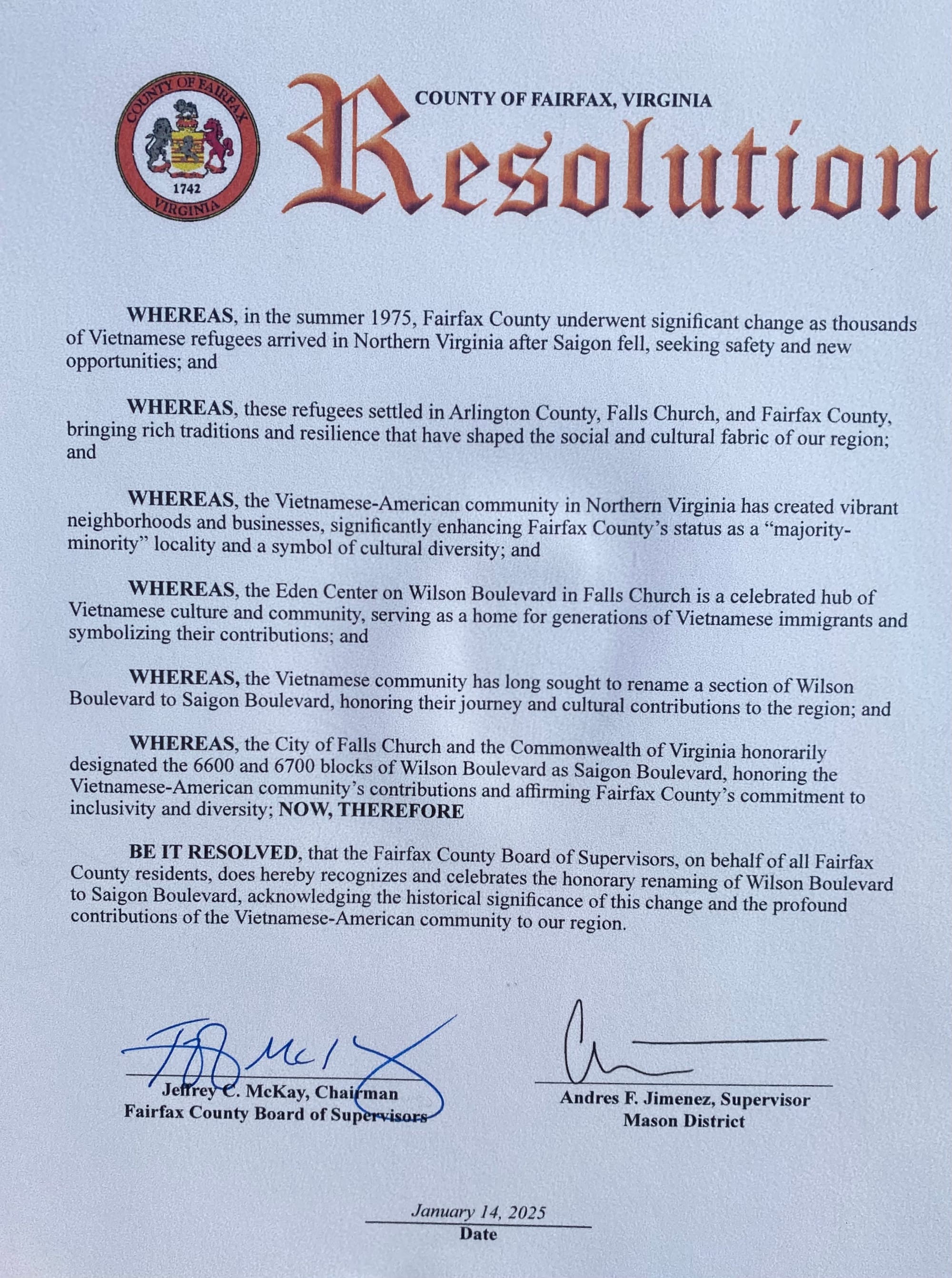 McKay then joined with Supervisor Jimenez to read out a formal resolution passed by Fairfax County to honor the local Vietnamese community with the new street signs. “The Vietnamese-American community in Northern Virginia has created vibrant neighborhoods and businesses, significantly enhancing Fairfax County’s status as a ‘majority-minority’ locality and a symbol of cultural diversity," a clause in the Resolution reads.