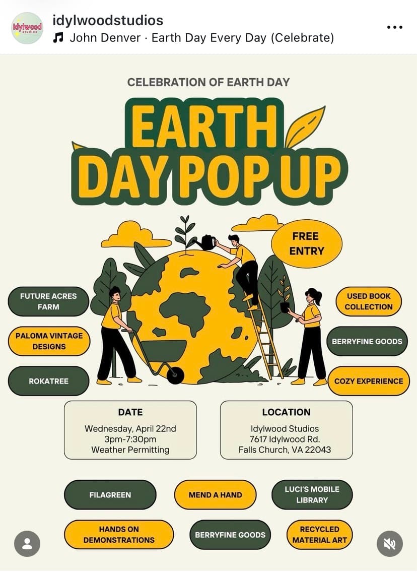 Idylwood Studios of Falls Church is pleased to announce its “Earth Day Pop Up Event,” a celebration of Earth Day on Wednesday, April 22, from 3 – 7:00 p.m. The event – free and open to the public – will be at 7617 Idylwood Road, Falls Church.