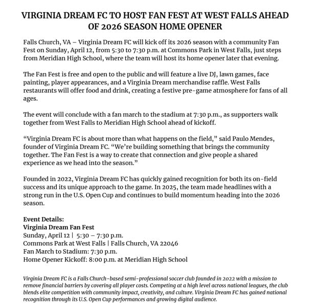 Virginia Dream FC to Host Fan Fest at West Falls Ahead of 2026 Season Home Opener, April 12