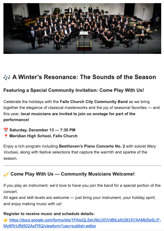 "Join the City of Falls Church Concert Band for our “Come Play with the Band” event at A Winter’s Resonance: The Sounds of the Season — Saturday, Dec. 13, 7:30 p.m. at Meridian High School. Featuring performances of Beethoven, Mahler, and holiday favorites," the band posted. "Warm up with us at 6:45 p.m., then help fill the stage with holiday cheer!"