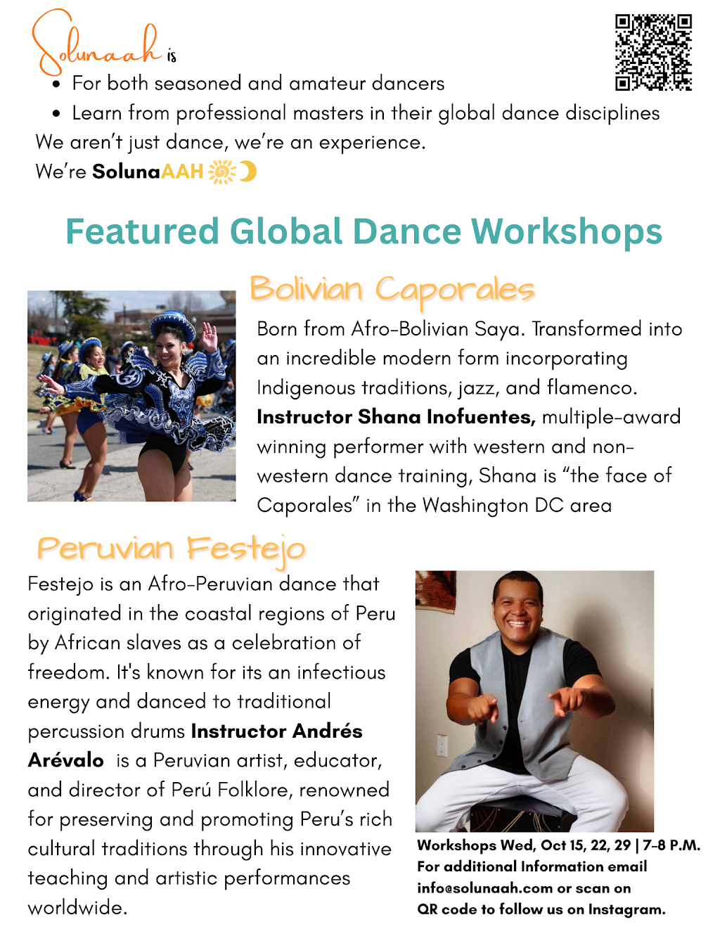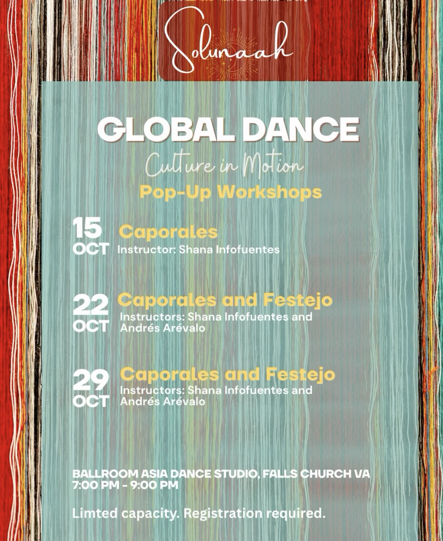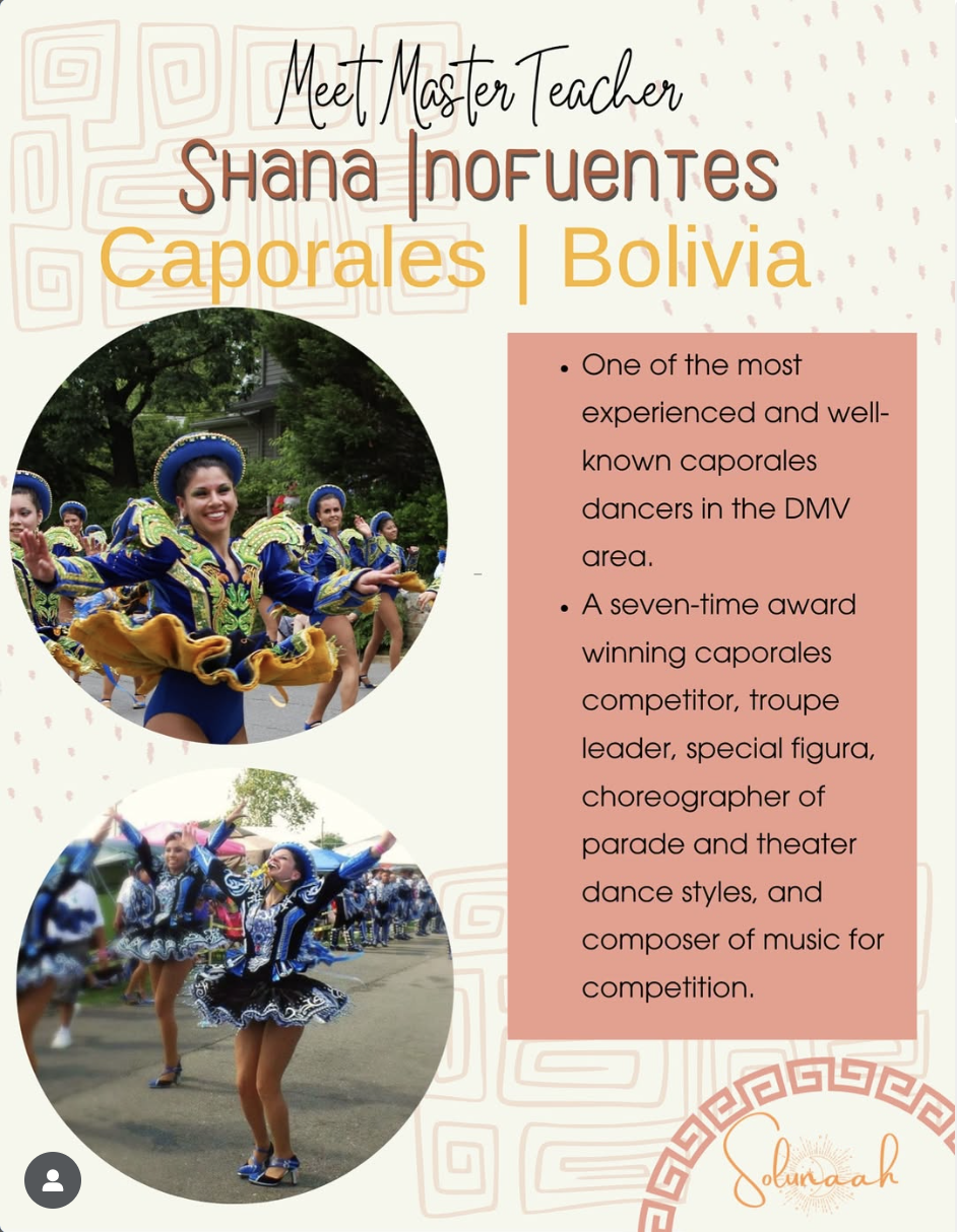 One of Solunaah’s strengths is its instructors. Relying on the founder’s vast network and decades in dance, the team identifies award-winning and highly experienced dance teachers to lead each month’s experiences. October features renowned performers Shana Inofuentes for Bolivian Caporales, and Andrés Arévalo for Peruvian Festejo. Learn more about each on Solunaah’s Instagram account.