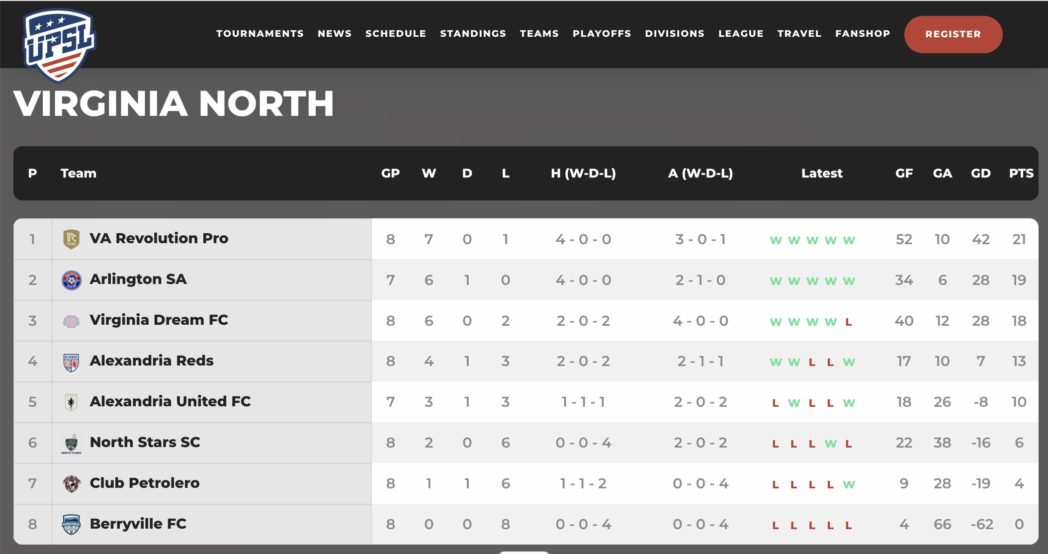 Here are the UPSL current standings, with Virginia Dream FC in third place, but only 3 points behind frontrunner VA Revolution Pro: