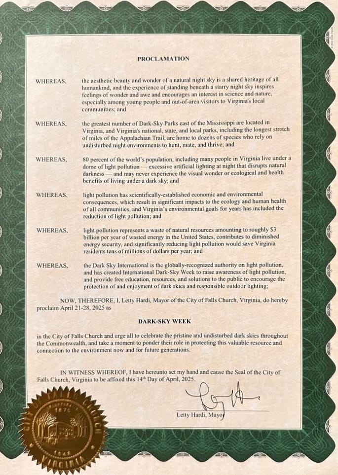 "Thank you Mayor Hardi and City of Falls Church Government City Council members for recognizing 21-28 April 2025 as Dark Sky Week in Falls Church!!," posted DarkSky NOVA – the Virginia chapter of DarkSky International – on Facebook yesterday April 15. "Falls Church City joins in the global celebration for IDSW [International Dark Sky Week], raising awareness of light pollution and educating its residents."