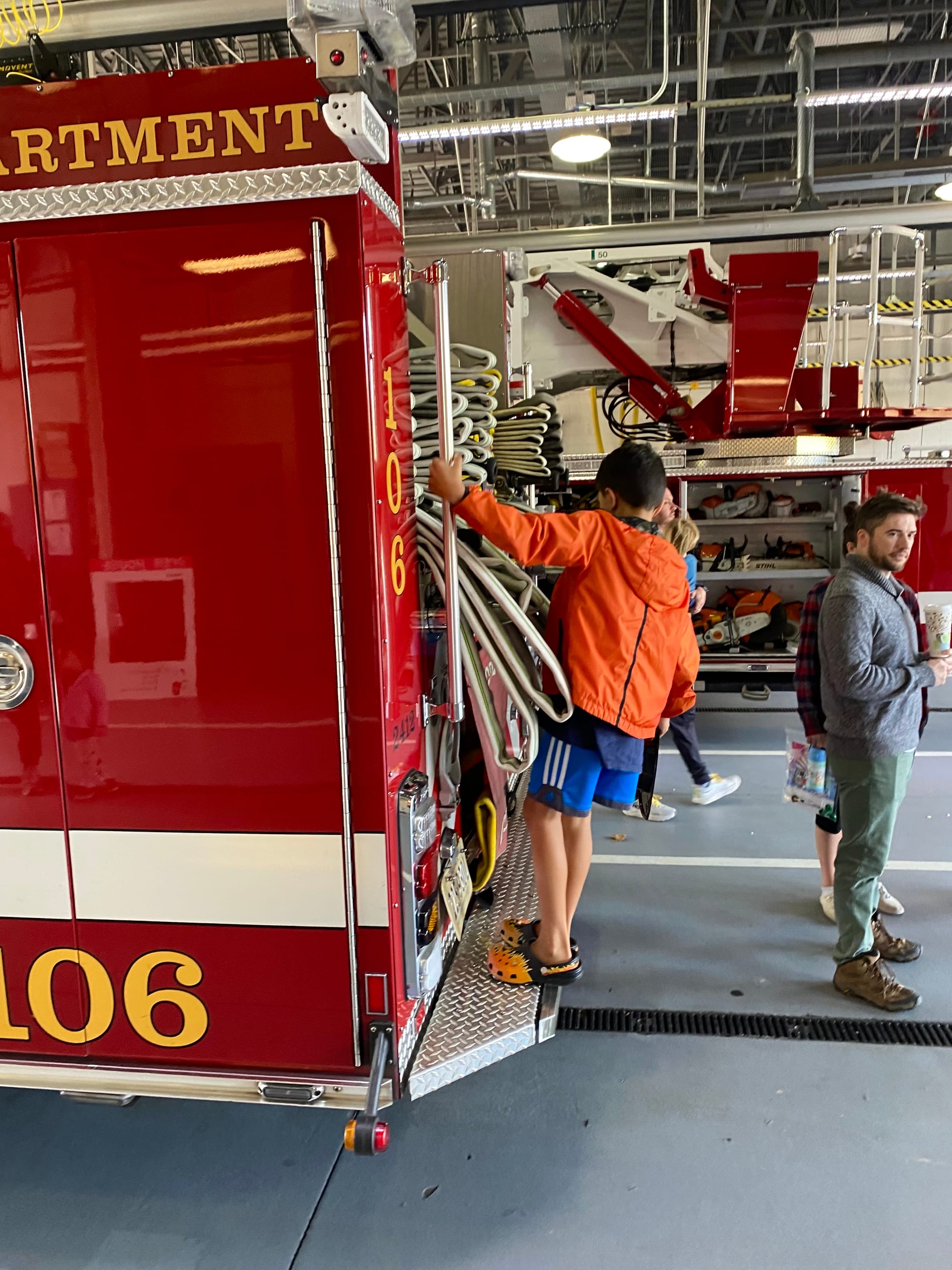 Outside by one of the fire engines, we met Ami [last name withheld] with her husband and three children, all busy taking in the fire station’s sites. “We actually just happened to be driving by and saw the sign for Open House and all the kids love firetrucks so much, we wanted to come see them today,” Ami said. “They’ve had a great time. They got a tour from a firefighter and he showed them all the equipment and all the different compartments of the fire truck and we got to see the ladder open up and the whole ladder extended which was pretty amazing. And we all got to shoot a fire hose…. that was definitely a highlight. And we did too. My husband and I also got to shoot the water hose…. It’s been a great day and a great event. We’ve been really happy and it’s been unexpected fun.”