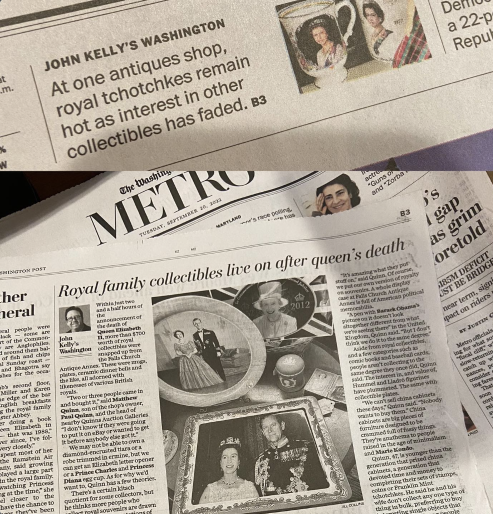 With deadpan wit, Quinn seemed to relish parrying my questions. His devotion to the antiques and collectibles trade, the Falls Church community, and his many thousands of customers, however, shone through.