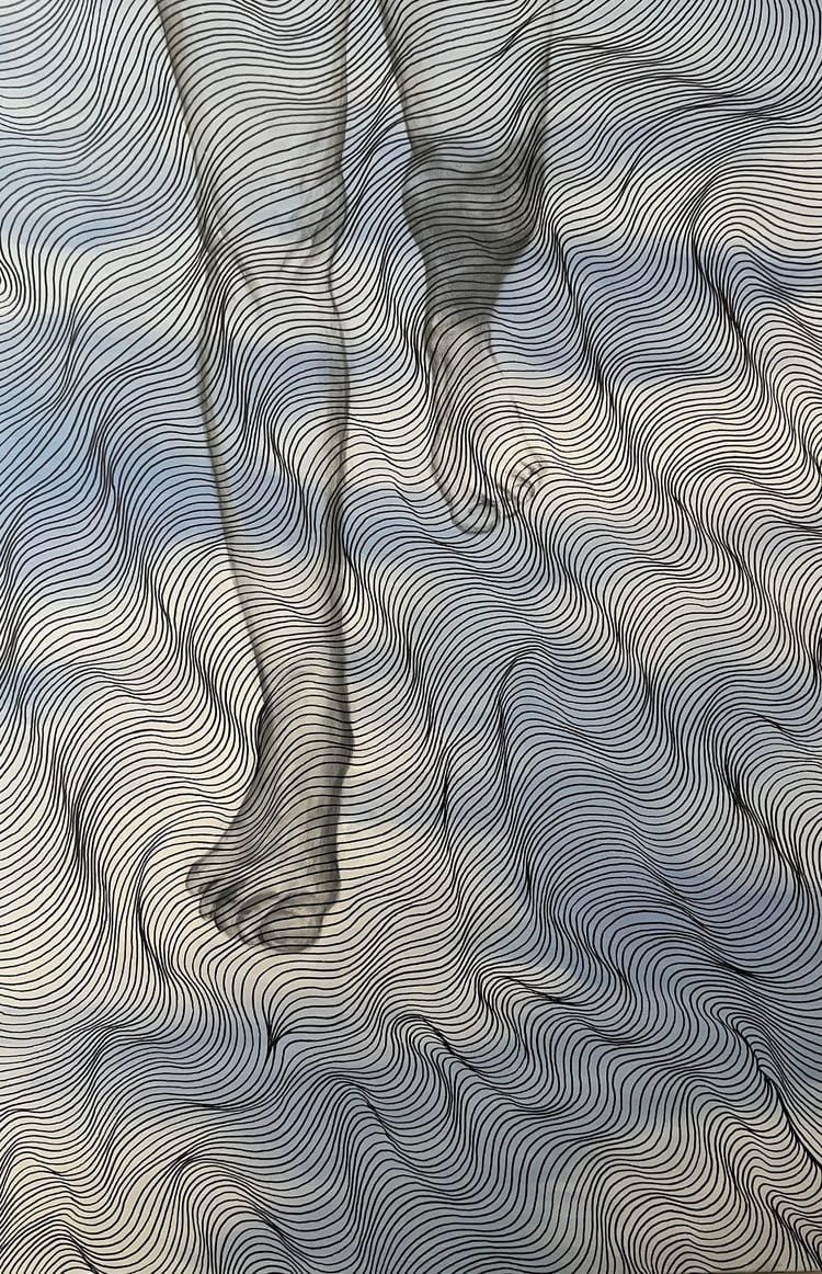 In a recent League of Reston Artists USGS Exhibition, Juror Bettina Brunner described how she was moved by one of Kamalieh’s pulsating pieces. “I was drawn to the undulating 3-D patterns in this work, which reminded me, in rapid succession, of fabric, cells, tree roots and sound waves. I appreciated the stark simplicity of the yellow background and black ink lines. The thoughtful artist statement highlighted a multi-year exploration of empty space, revealing a body of work pushing the boundaries of the unseen and unexplored. Upon reading the artist’s statement, I viewed the work with even greater appreciation, visualizing the waves transforming from straight lines to undulating patterns and shapes. While the work is simple, its themes are complex and meaningful.”