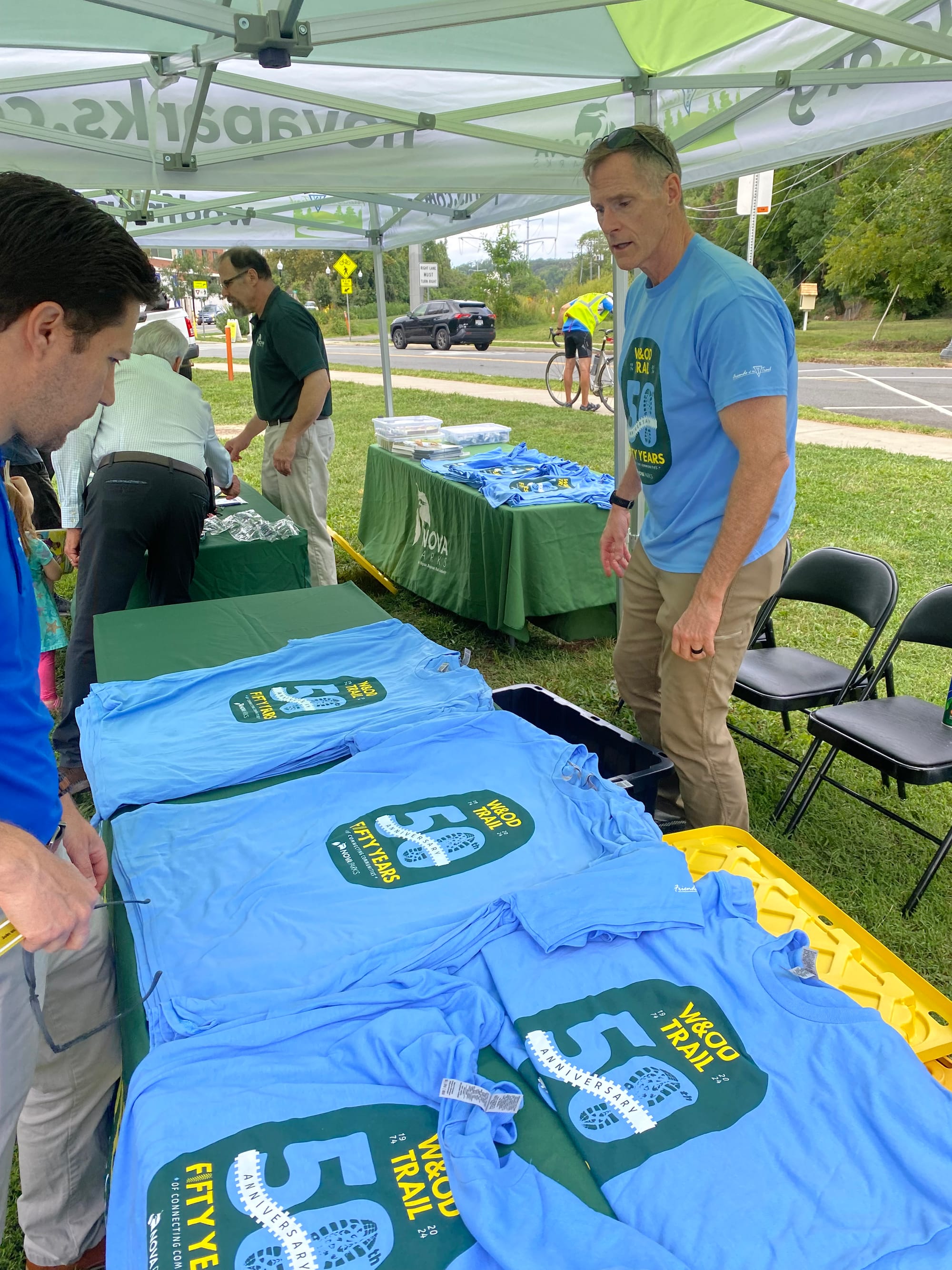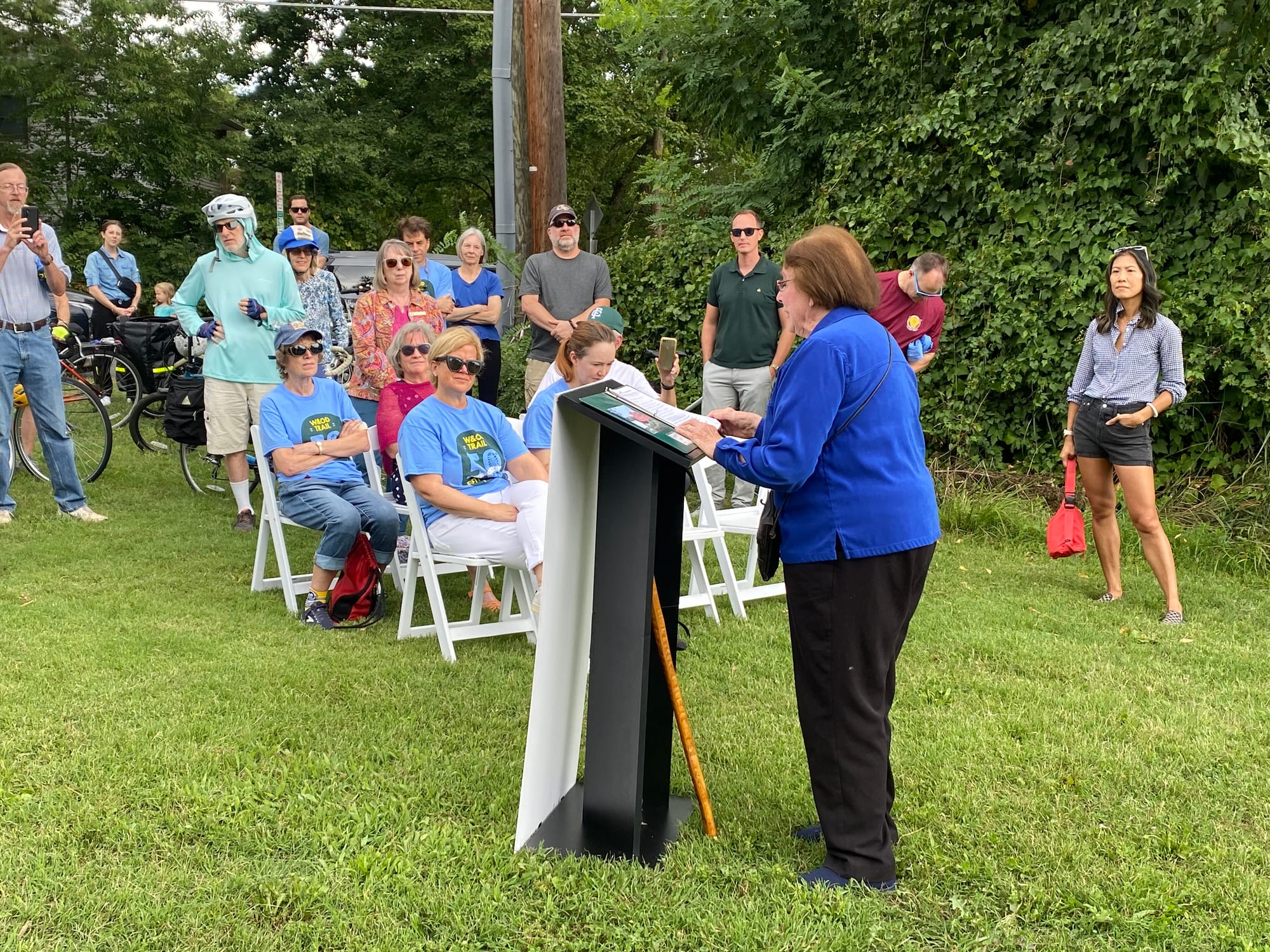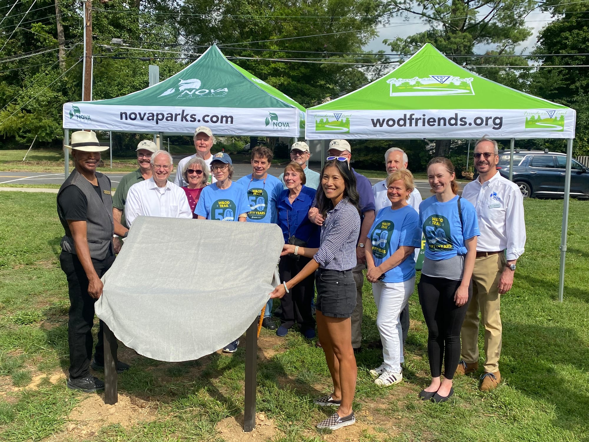 Along the trail at N. West Street near Founders Row, Saturday Sept. 7, the City held a cheerful 50th anniversary celebration for the beloved W&OD Trail in the cool, bright morning air. Near the Northern Virginia Parks (NOVA Parks) and Friends of the W&OD Trail events tents offering free anniversary t-shirts and generous commemorative swag, a lectern and folding seats were set up in the grass, while many passing walkers, joggers, bikers, stroller-pushers, and dog walkers were bustling along the trail soaking in the sunshine.
