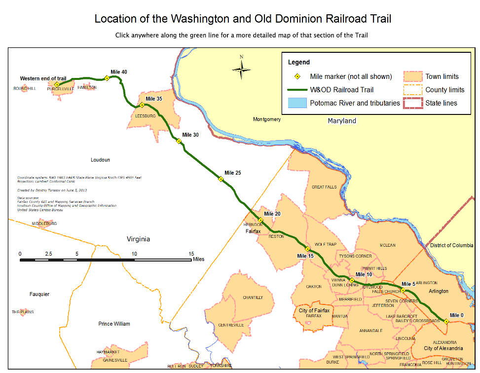 And today, the W&OD Park that incorporates the W&OD Trail is described by NOVA Parks on their website: “Often called the skinniest park in Virginia, Washington & Old Dominion (W&OD) Railroad Regional Park is a paved trail between Shirlington and Purcellville, Virginia. Run, cycle or [rollerblade] the 45-mile route along the former roadbed of the Washington & Old Dominion Railroad, which runs through the urban heartland and into the Virginia countryside. Equestrians can ride the adjacent 32-mile gravel horse trail. The W&OD trail has multiple parking areas, enabling you to jump on and off the trail at various points.”