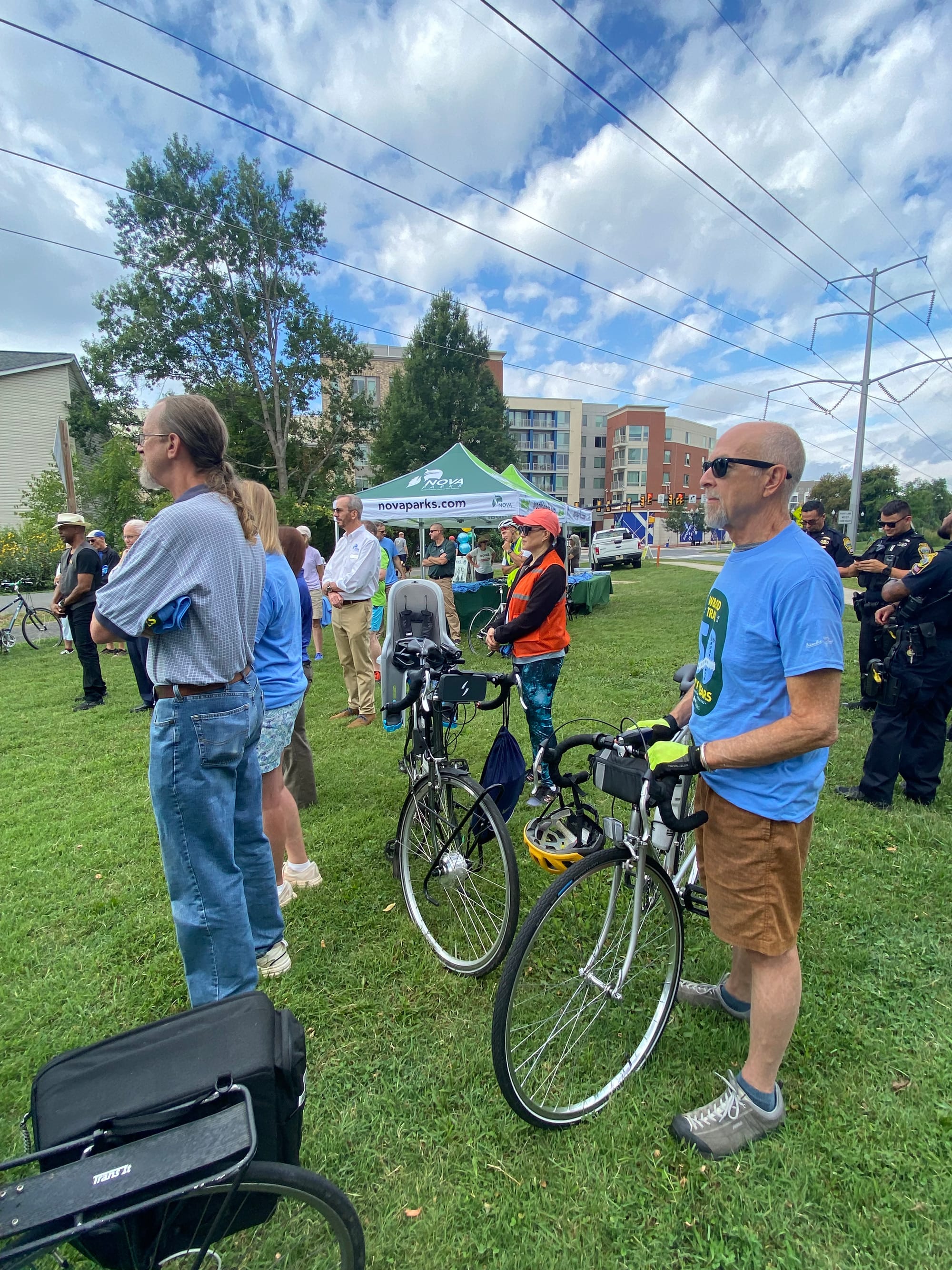 Speakers at the celebration included City of Falls Church Mayor Letty Hardi, NOVA Parks Vice Chair, Paul Baldino, Friends of the W&OD Vice Chair, Judy Collins, and the “Mother of the W&OD Trail,” NOVA Parks Board Member, Barbara Hildreth. City of Falls Church Police Chief Shahram Fard was on hand with a group of officers to provide security and City Council Member Justine Underhill – in full bike kit – was also spotted in the milling crowd that included many with their bicycles by their sides, water bottles in hand, or kids in their clutch.