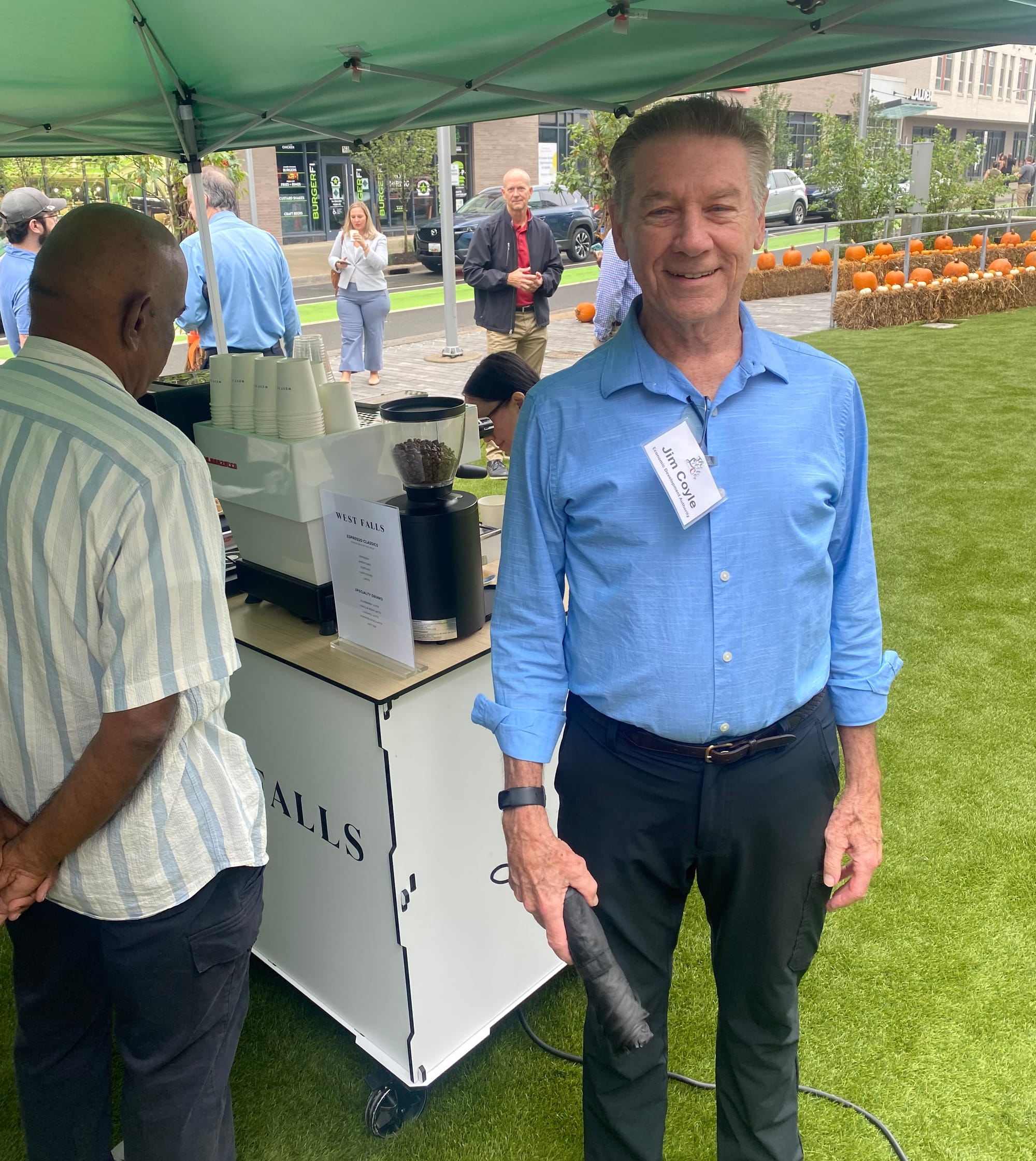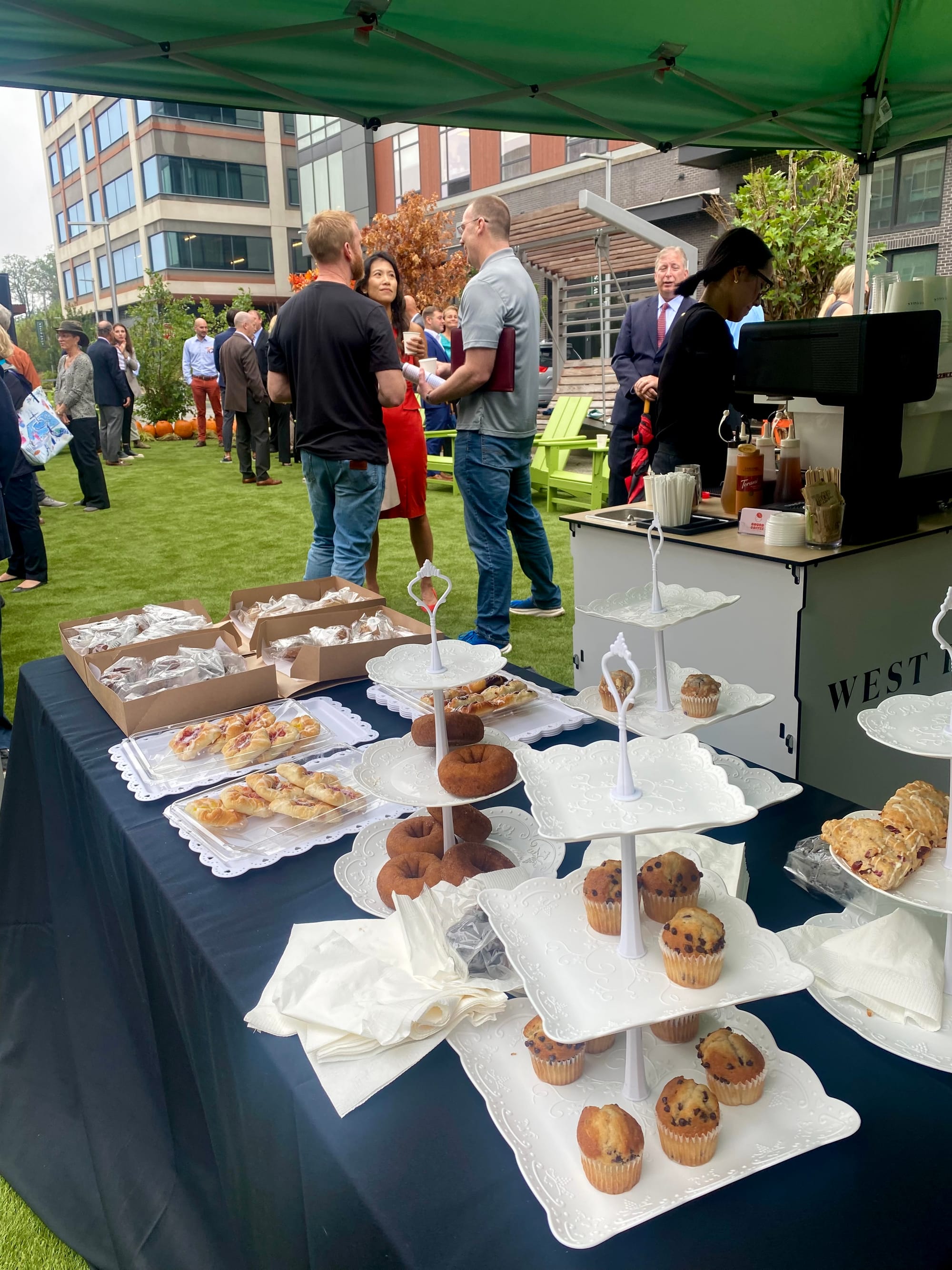 All around, stakeholder groups were assembling to take celebratory group photos near the festive fall pumpkin and foliage decorations (placed in preparation for West Falls’s Fall Festival, Sunday, Sept. 28.) A fancy West Falls coffee bar, with delicious pastries from Northside Social was also set up for guests.