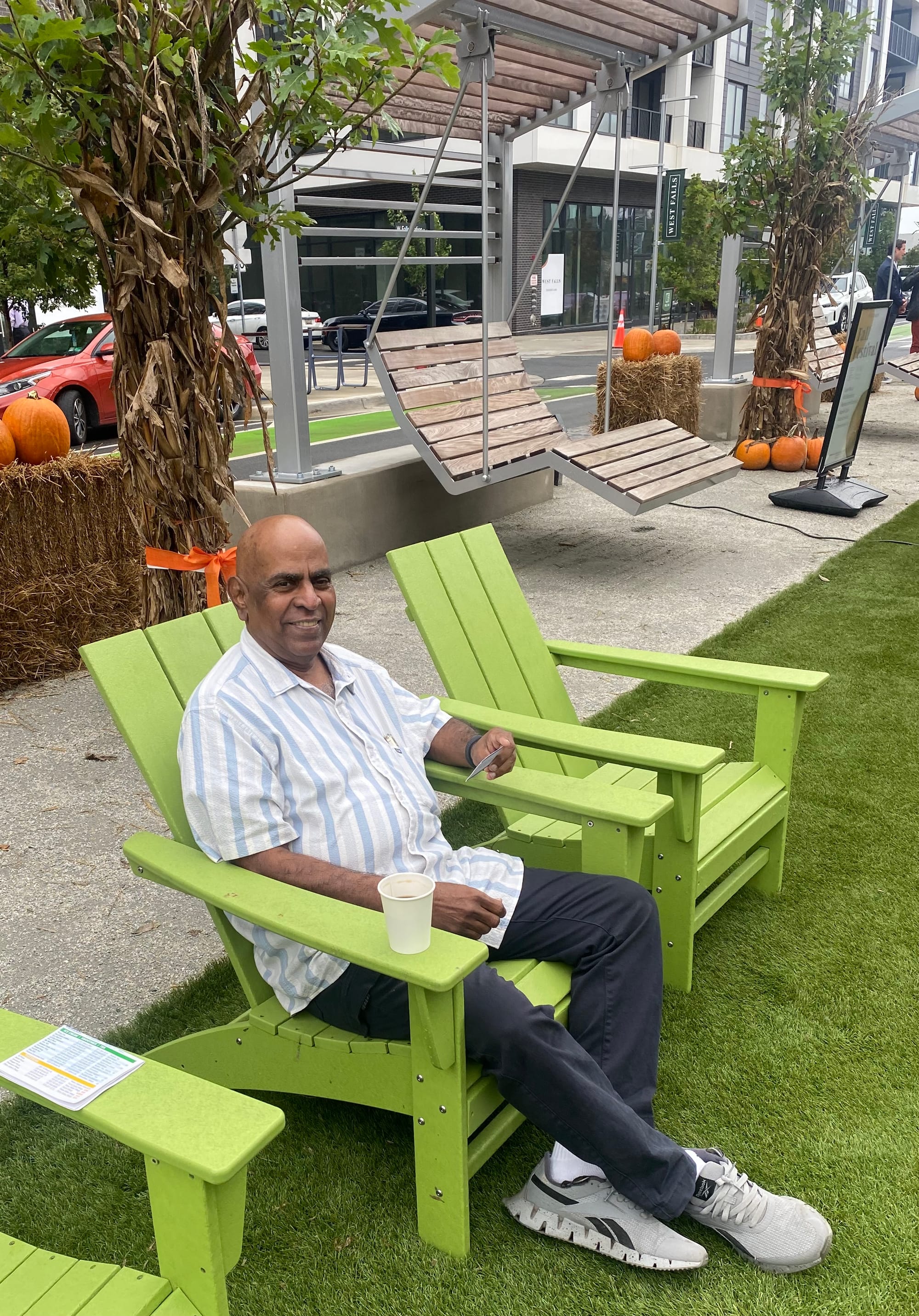 Sadasivan enjoys exercising by walking nearly "seven miles a-day," but also appreciates being able to walk to his doctor’s office or the bank nearby. He also loves all the restaurant choices in the West Falls neighborhood. “Oh, I’ve been to all these places,” he said, pointing to several restaurants. “Burger Fi will open soon and the Thai food there. We’ve been to the Japanese restaurant. And other places also. I’ve been there and I've been there. And many of these restaurants.”