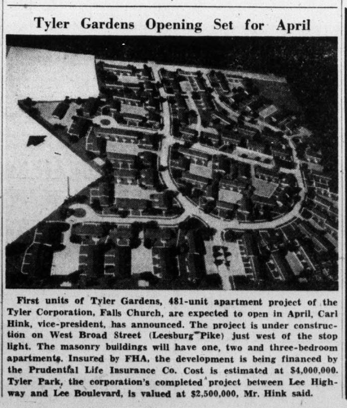 The "First units of Tyler Gardens, 481-unit apartment project of the Tyler Corporation, Falls Church, are expected to open in April, Carl Hink, vice-president, has announced," per the Standard. "The project is under construction on West Broad Street (Leesburg "Pike") just west of the stop light. The masonry buildings will have one, two and three-bedroom apartments."