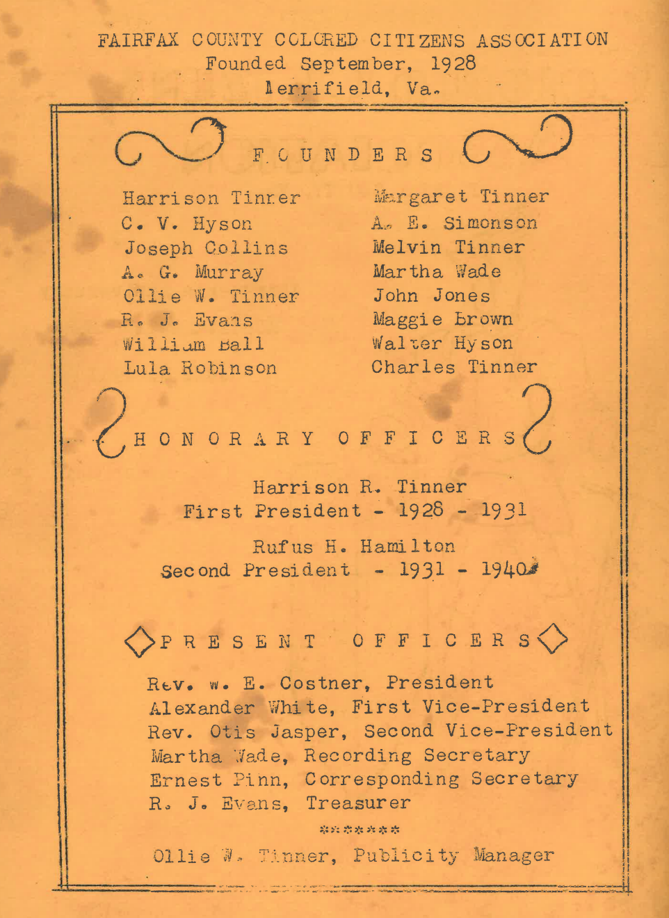 According to one of its brochures, the CCAFC's mission was: "To organize the Negroes in Fairfax County, Virginia for the purpose of voting in all elections. Aims: To better Negro citizenship in Fairfax County through its stand for: