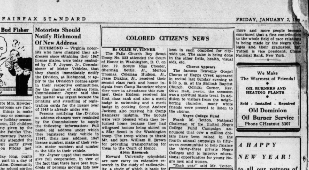 When we first spotted the "Colored Citizen's News" on p. 2 of the Standard's Jan. 2 edition, we were prepared to read perhaps some not-too-subtly racist put-downs reflective of 1948 Fairfax, Va., still six years before the Brown vs. Board of Education ruling desegregating U.S. public schools.