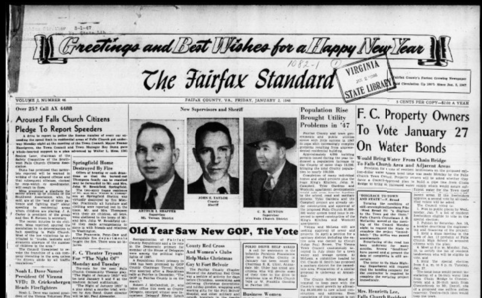 Soon something from early January, 1948 caught our eye. Back then, The Fairfax Standard weekly newspaper covered the Township of Falls Church as it was still within Fairfax County, Va., and not yet an independent city – though it would become so later in the year.
