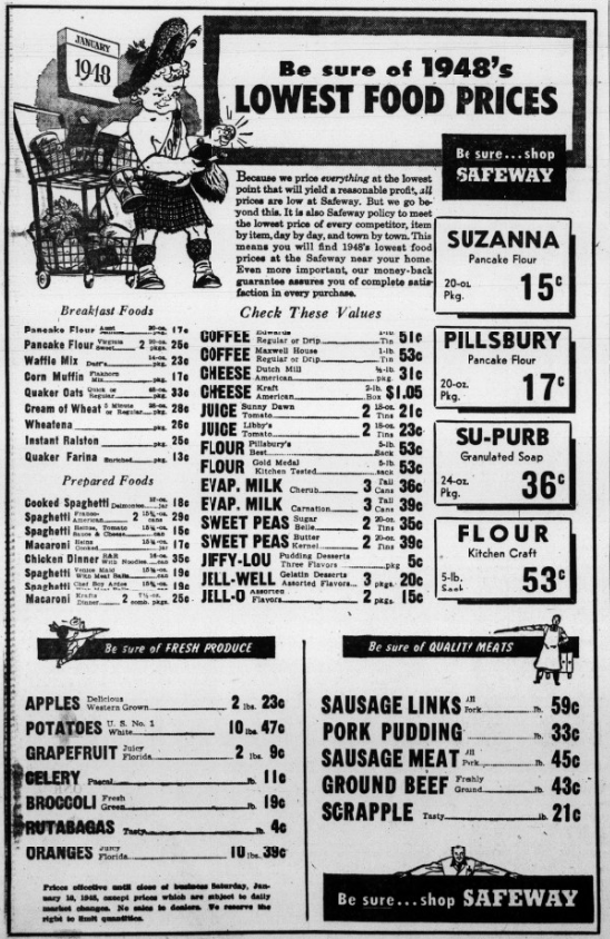 Wish you could escape inflation and go back in time to cheaper prices – like a 35 cent chicken dinner? Then, check out these prices from Jan. 9, 1948 in the Standard!