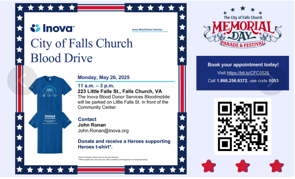 - Inova Blood Drive, located outside the Community Center (11 a.m. to 3 p.m.)