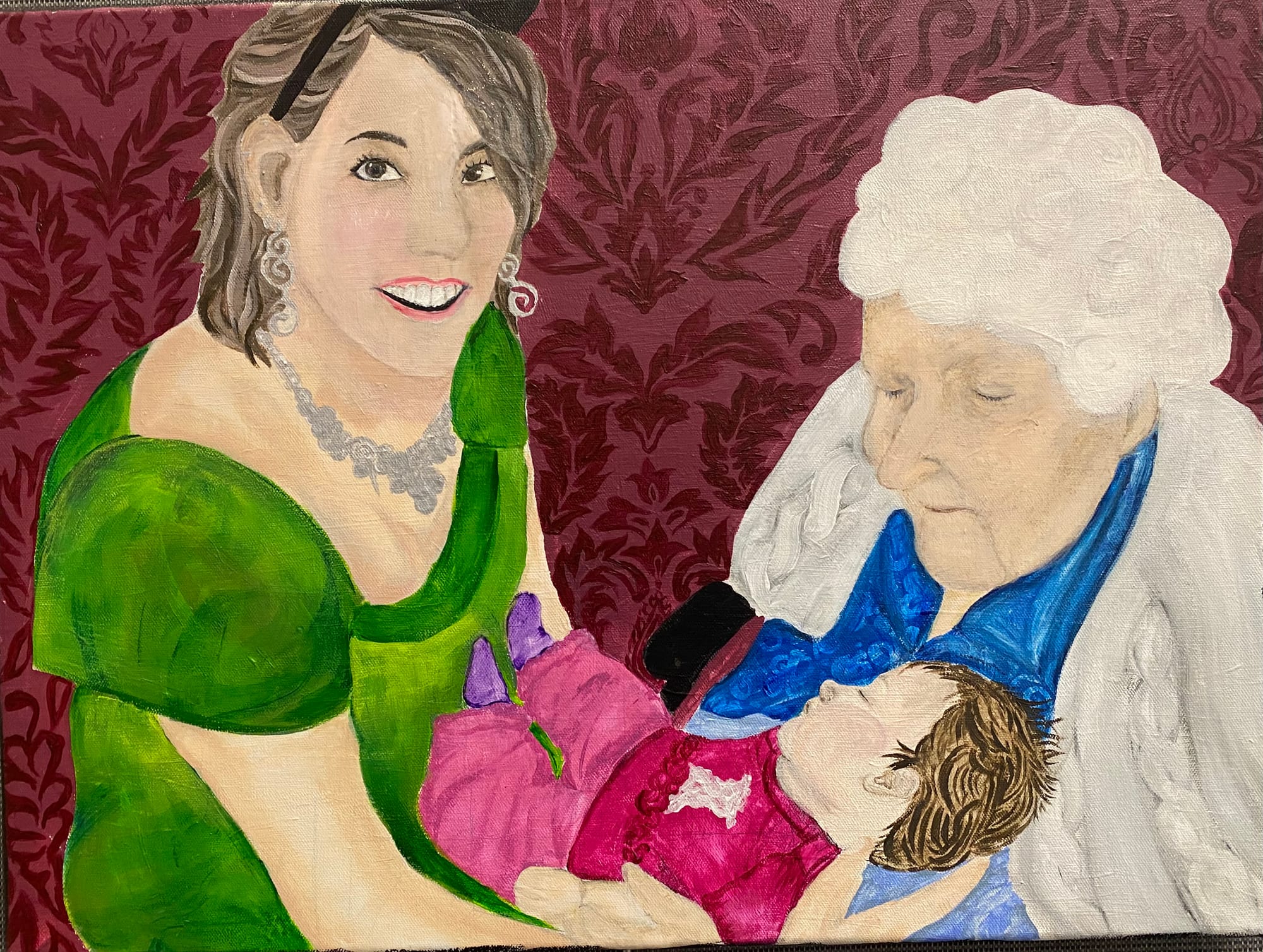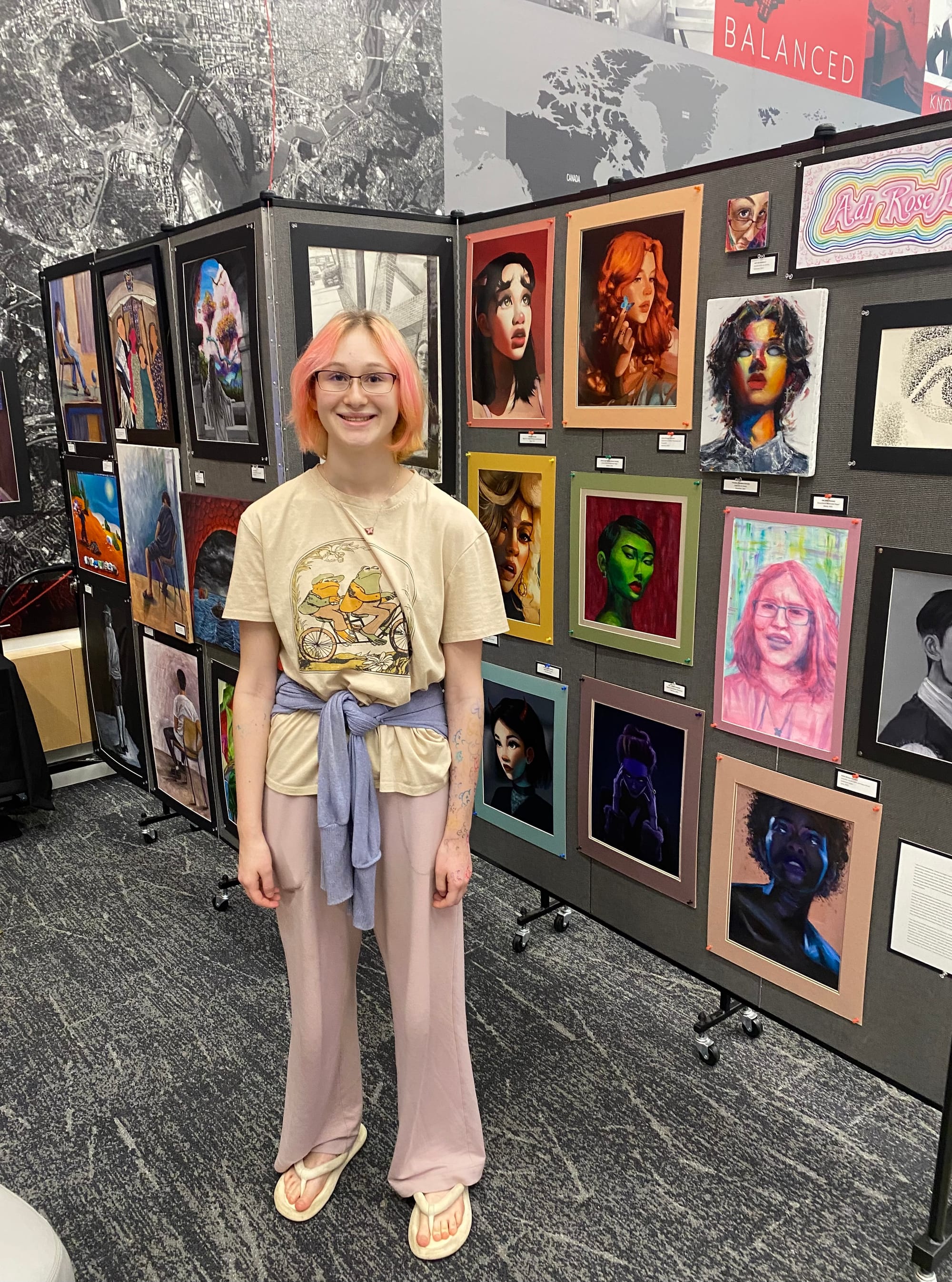 Henderson will be attending top-ranked VCU School of the Arts in the fall. Asked her preferred medium, she said, “I mostly do digital and acrylic painting. But I’m in ceramics class this year…. I very much like colors and people…. And I feel there’s a lot of story-telling you can do with people. And obviously I like colors. My hair was rainbow once upon a time. It’s really faded now. Kira’s actually going to re-dye it for me, which is awesome. But there are colors everywhere. There’s a whole set of things that are just in a rainbow…. My room at home – the walls are pink and the ceiling is rainbow. It’s awesome.”