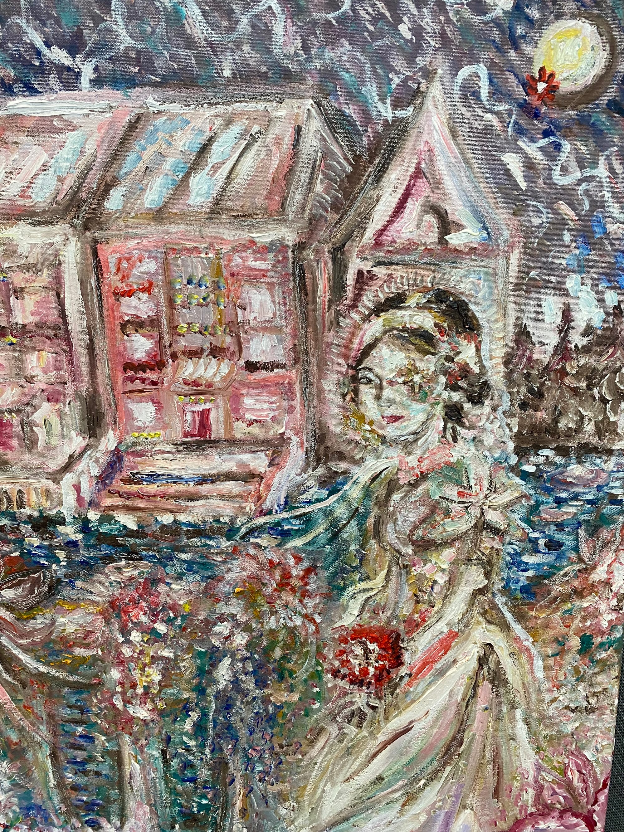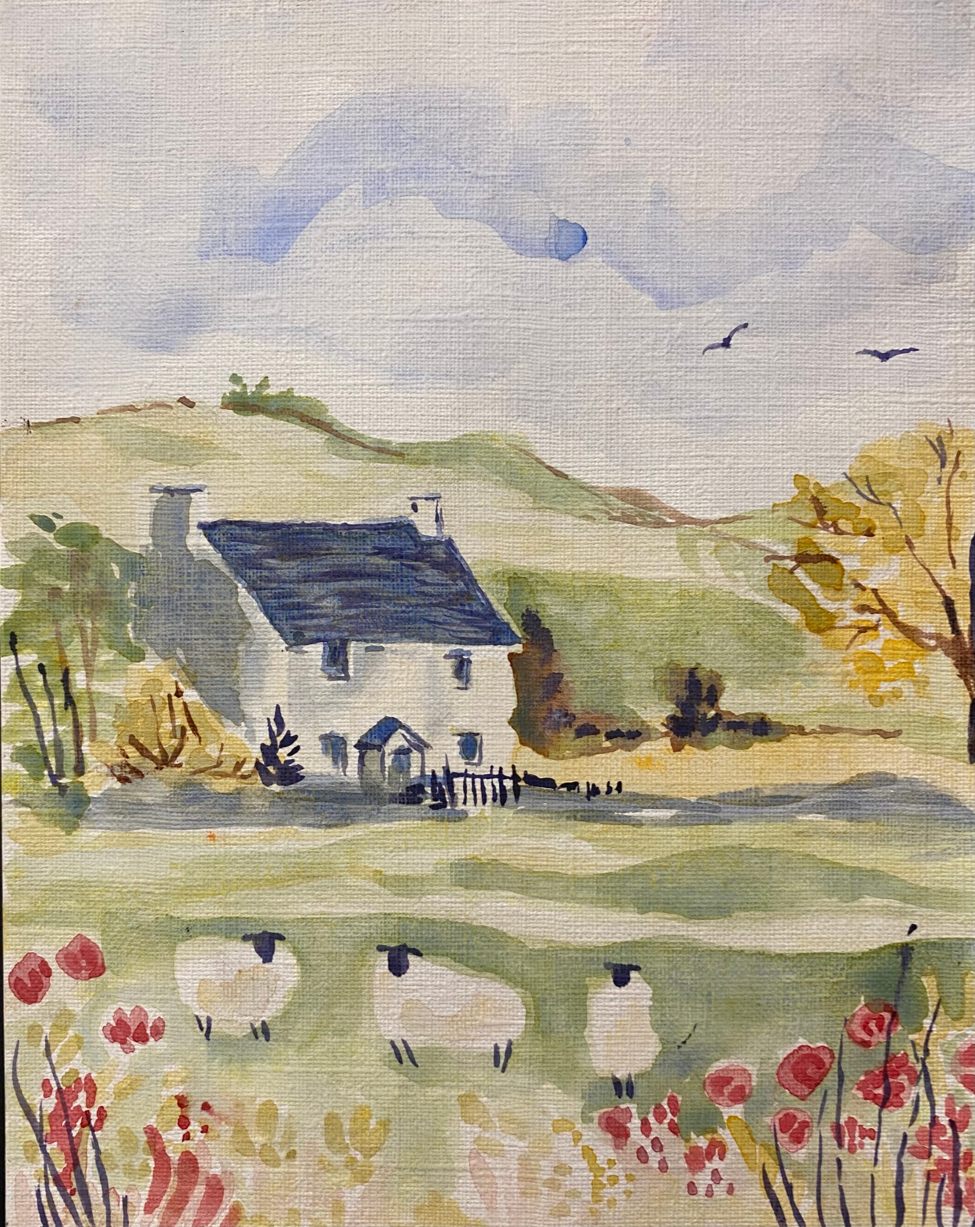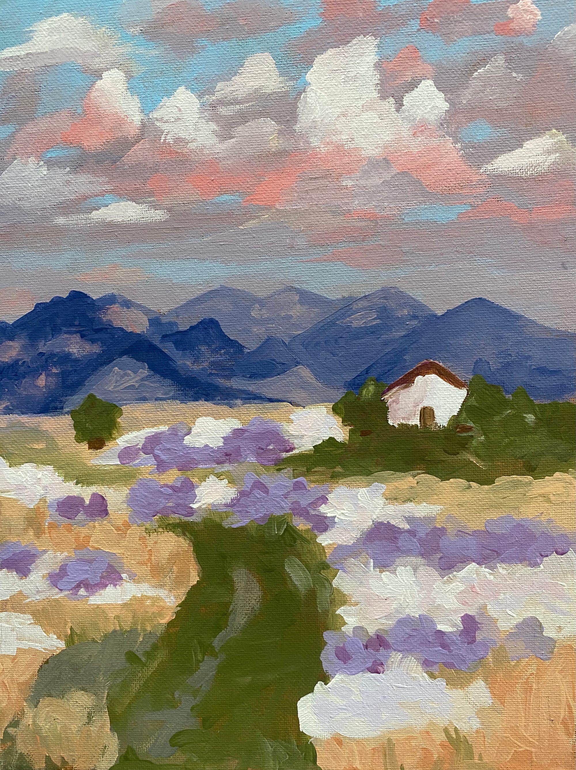 Asked if all the writing requirements in IB Art helped her conceptualize her artwork, Kosmider replied “Some of it, definitely. Because IB is like when you do a project based on research you’ve done. And one of my projects is directly inspired by a painting I did research on…. ‘The Blueberry House’ [Points]. It’s based on ‘Haskell’s House’ by Edward Hopper. The first time I saw it, it reminded me of my grandparents’ house, and I thought, ‘Wow, it might be nice to paint my grandparents’ house in a similar style.’”