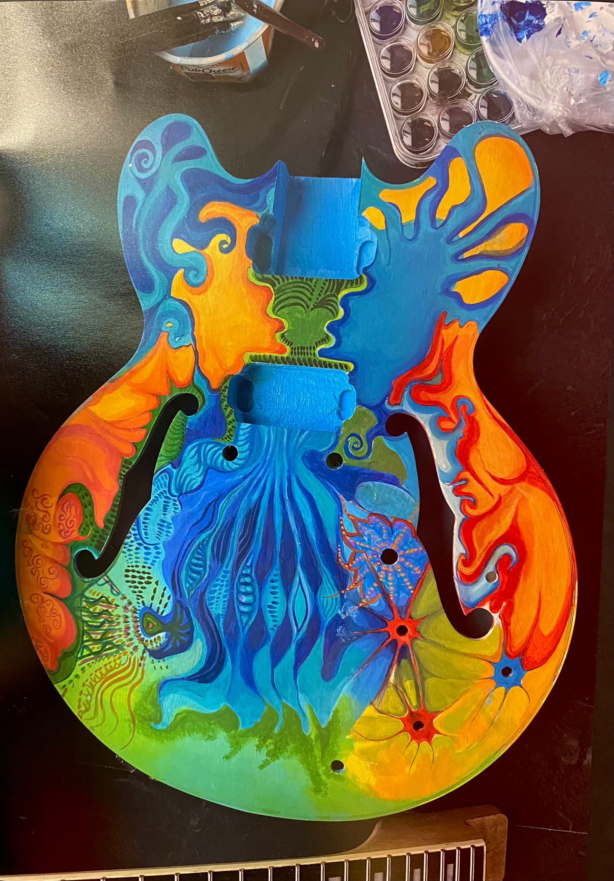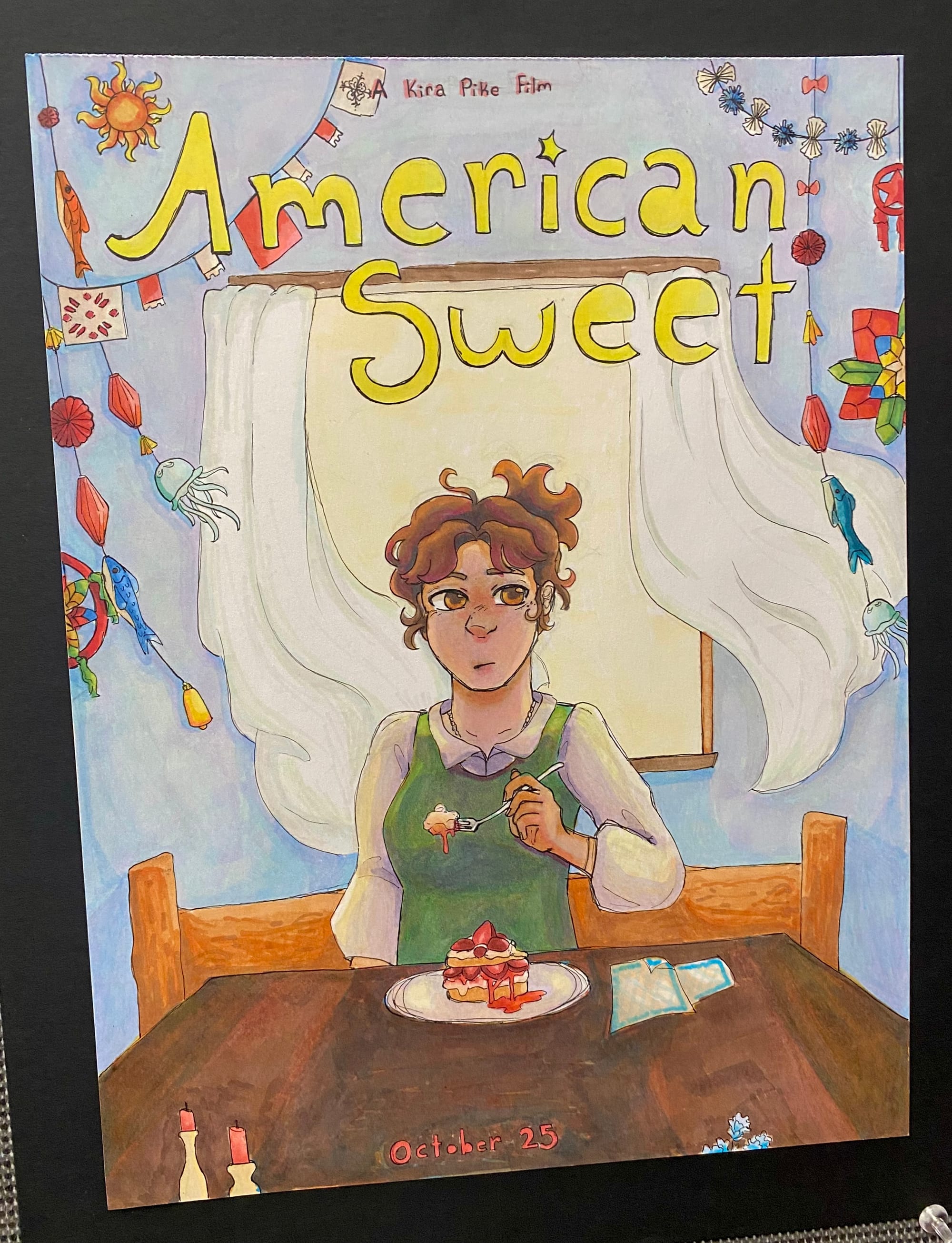 Pike described how her learning in other subject areas has informed her art. “In English this year we had a unit on album covers and analyzing how musical artists put together their [visuals], so I took inspiration from different things I learned in that unit and was able to [draw from what] I’ve learned in my classes that I think were interesting and that I wanted to delve into more. And a lot of my classmates in art have a lot about history or about social justice movements. But I’d say mine is a bit more self-indulgent in the fun side of things, rather than making any strong statements. But, it was very fun to put together.”