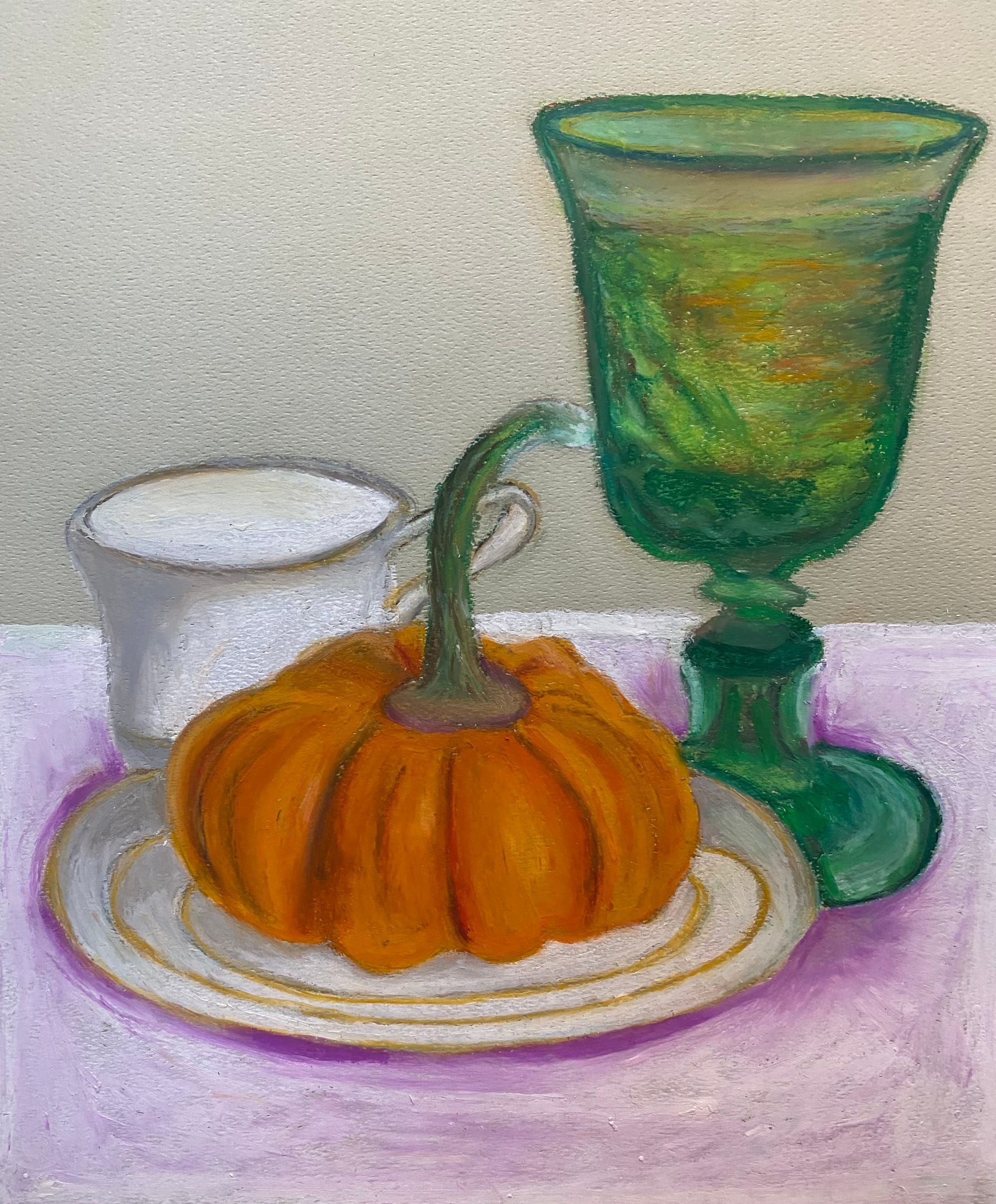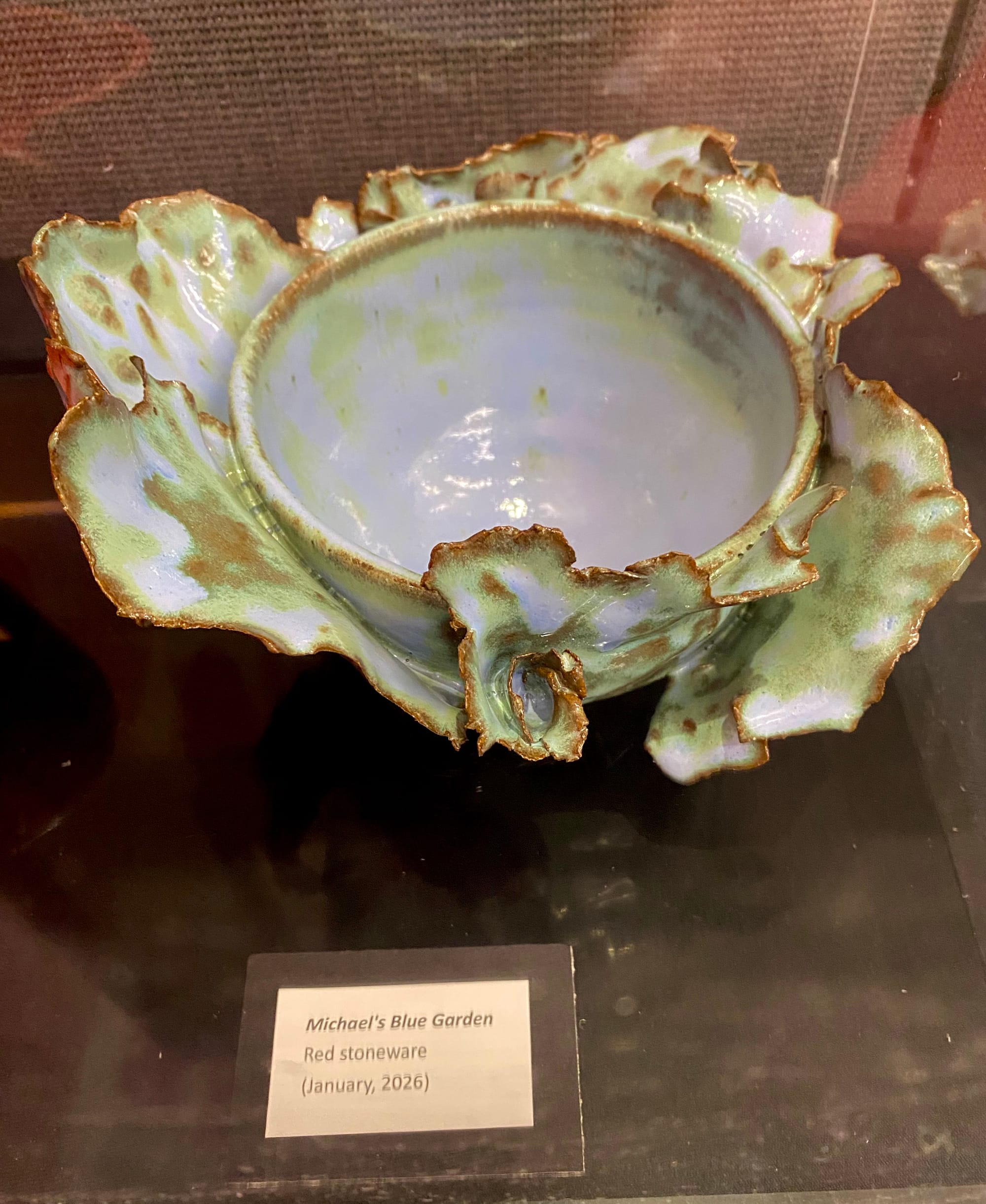 Sabrina dedicated her charcoal drawings to her mom. “I was really inspired by Georgia O’Keefe for both of the charcoal pieces,” she said. “Most of these pieces were inspired by Georgia O’Keefe and also Kurt Schwitters. He does collages. So, the wild textures collage is inspired by him. And then I also looked at Chala Toprak and she’s a newer artist who does ceramics. And she does more flowing leaf designs like [Sabrina’s] ‘Michael’s Blue Garden’ and ‘Green Bloom.’” To her father, Sabrina dedicated ‘Michael’s Blue Garden,’ as his favorite color is blue.