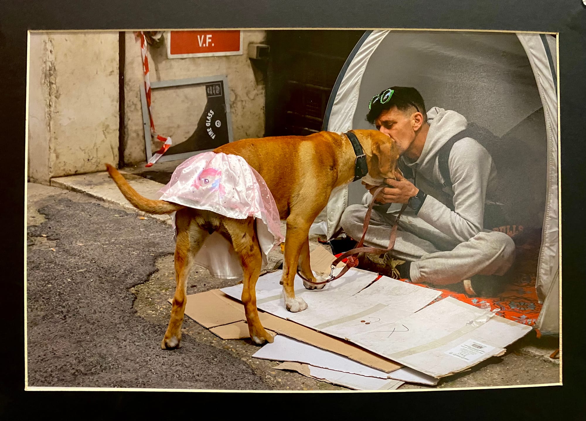 “And then I have a piece of photography [called “Home”] with a homeless man. He was playing catch with his dog. And I thought that was really cool to see a moment of love and care with the dog wearing a silly, unicorn, My Little Pony tutu. And I thought that was really a sweet moment where it’s kind of like a home inside, where maybe you don’t have a house, but there’s a lot of love there.”
