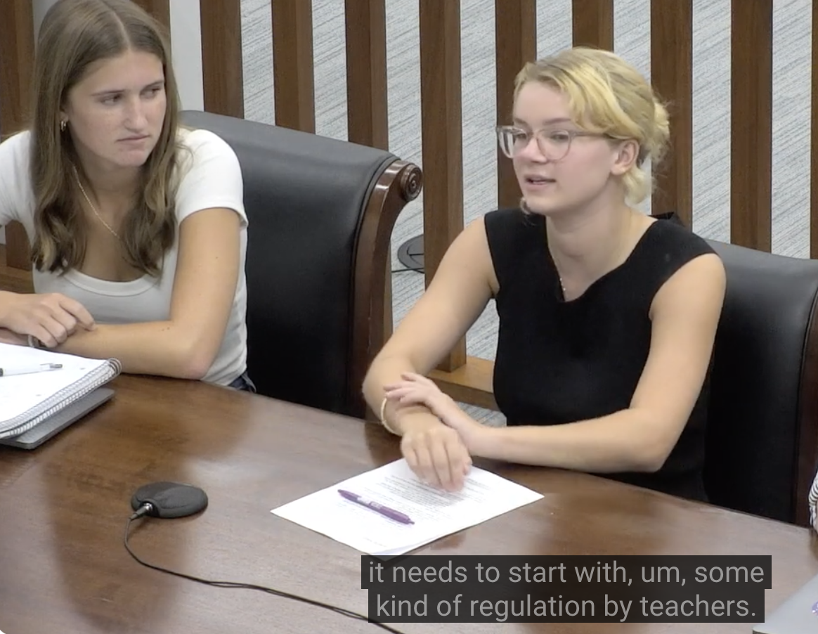 In an Aug. 13, 2024 Falls Church City School Board meeting, two rising seniors from Meridian H.S. – Senior Class President, Grace Calabrese and Charlotte Rice – testified about the importance of preventing cell phone distractions in the classroom during the school day, while also providing compelling examples of how they use cell phones to better organize their days and communicate with others on important matters. In the classrooms, Rice and Calabrese said, teachers need to set clear guidelines and expectations and phones should be put away.
