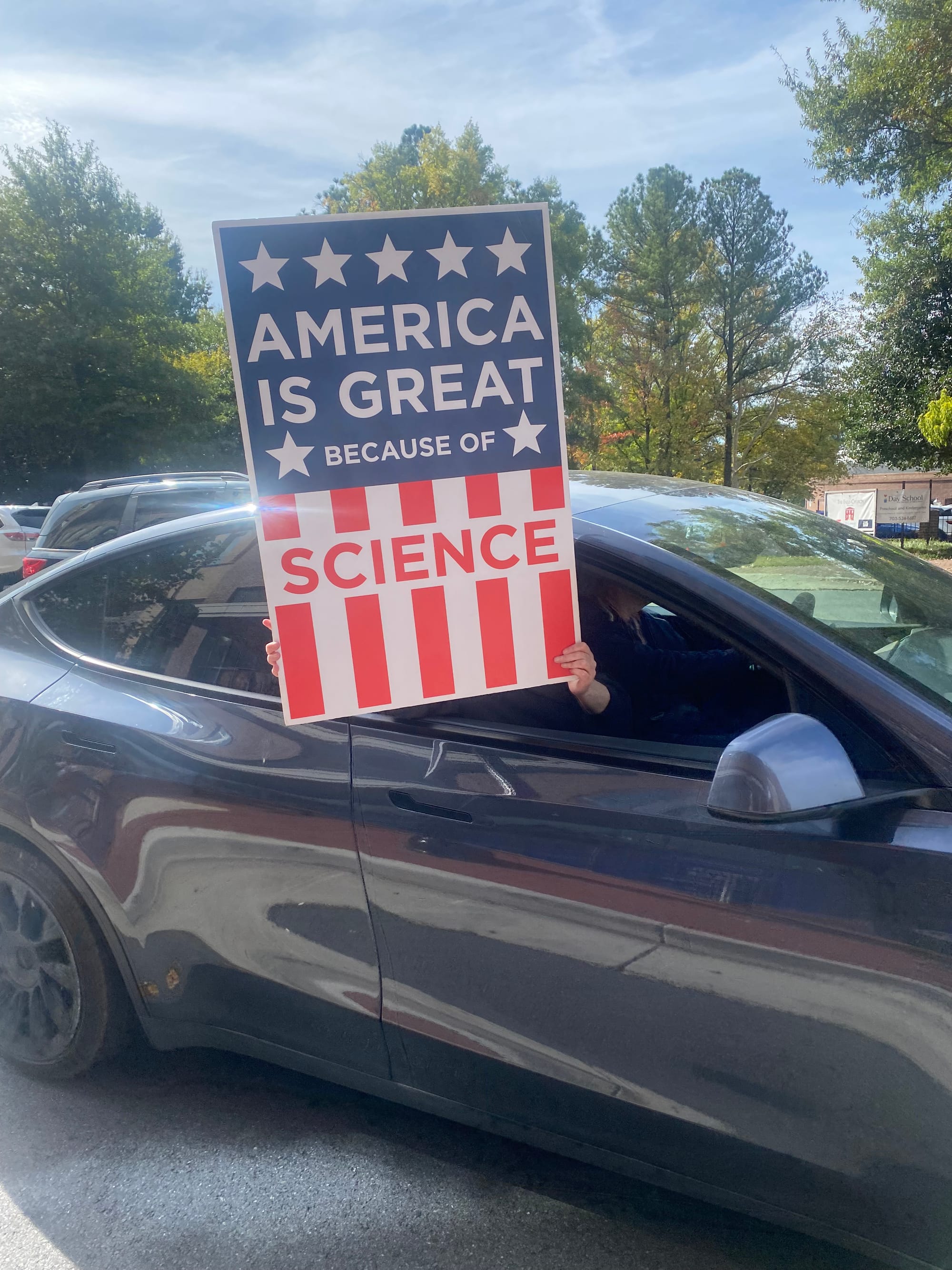 At DFC’s organizational tent, we also encountered rally organizer Louise Hilsen. She showed us a stack of signs “hand-painted by a furloughed federal employee” who feared being directly associated with the protests. “I think, for myself, I didn’t sign up [today] because I don’t want my name to show up on any list and I don’t trust this government not to misuse that kind of public information,” Hillsen said. But the anonymous sign-maker did “put out a lot of these signs and you’ll see them all over today’s protests.”