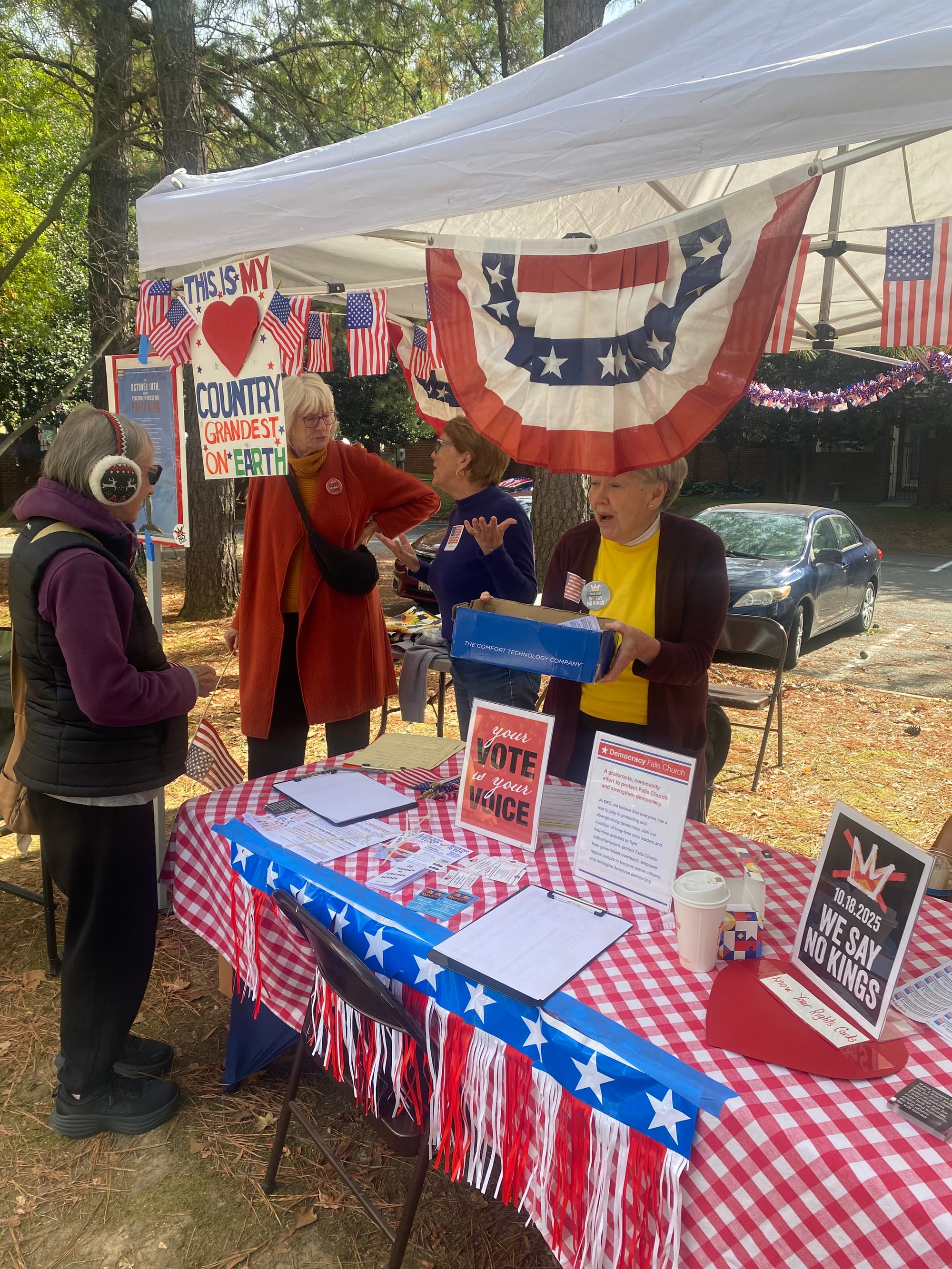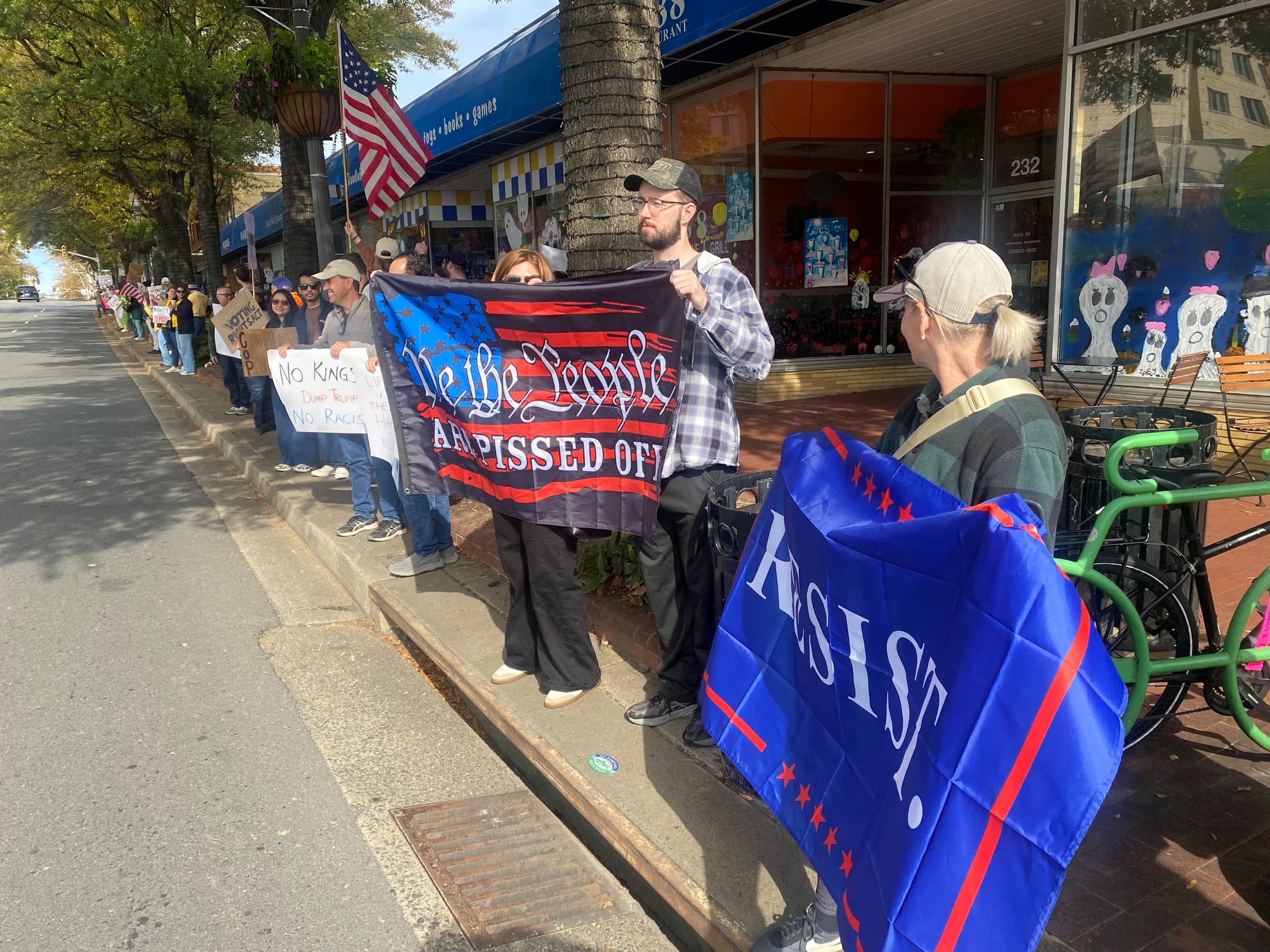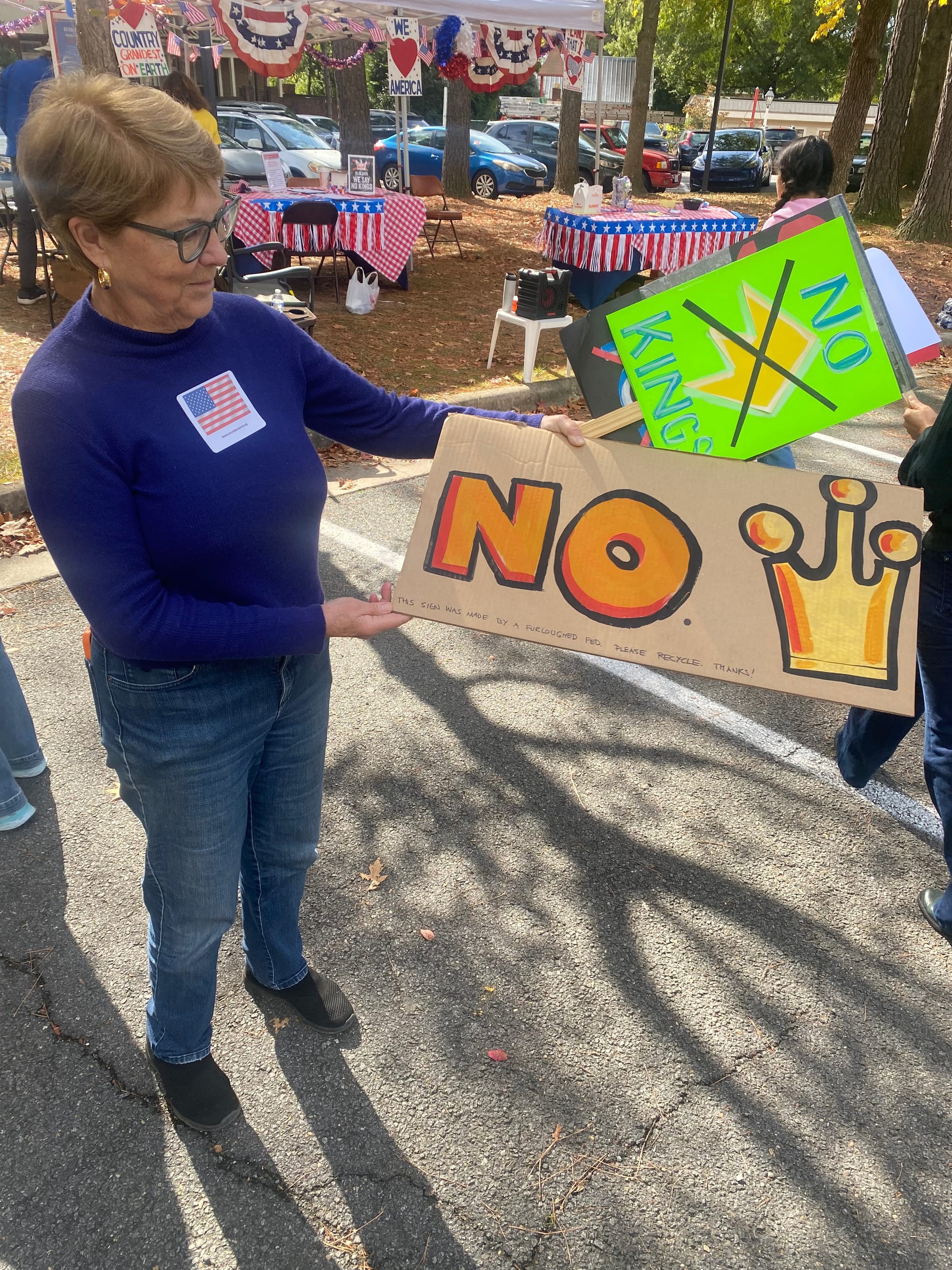 Rally organizer Lisa Margarella described how she was first motivated to join the No Kings movement. “I saw a little article in the newspaper and it was Ben [Allard], wanting like-minded people to just come out and to separate fact from fiction. And when we started, it was just a few people and he asked, ‘What are you worried about?’ And we all said, ‘Everything!’ There were just too many things that were upsetting to us. But I couldn’t just sit at home and do nothing.... And our group [DFC] is just super nice. A great community of people. And just even participating, making signs for people, making buttons for people, giving things out, just making sure people know what’s happening and they have a voice, that’s what I find really important.”