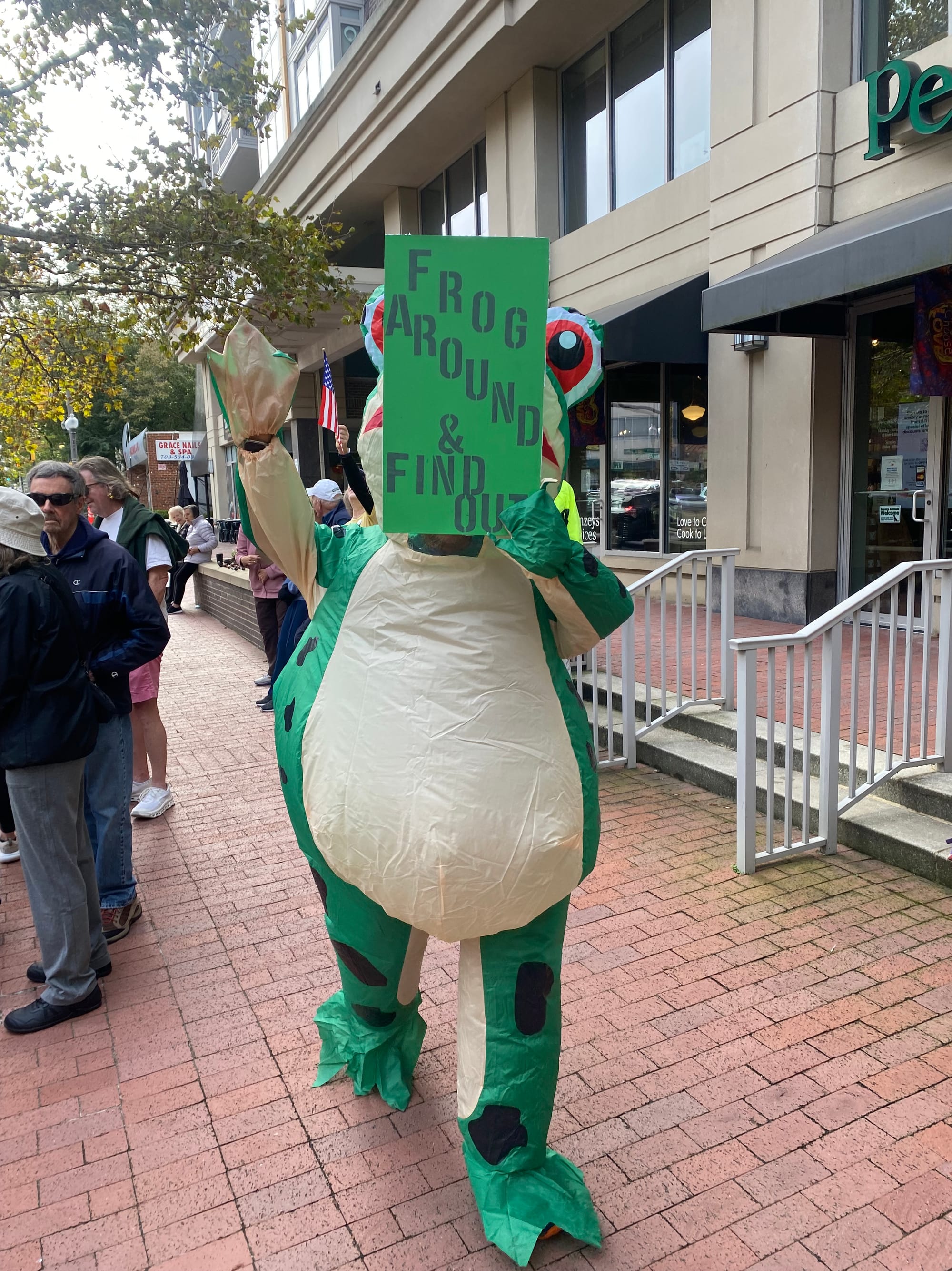 Following recent protests against National Guard mobilization in Portland, Oregon, cartoonish inflatable costumes used to avoid facial surveillance as well as to ridicule excessive shows of governmental force were seen sported by many puffed up protesters. Sadly, however, many ralliers in Falls Church on Saturday appeared less inclined than before to reveal their names or have their faces photographed, seemingly out of fear of retribution from the Trump administration or its allies.