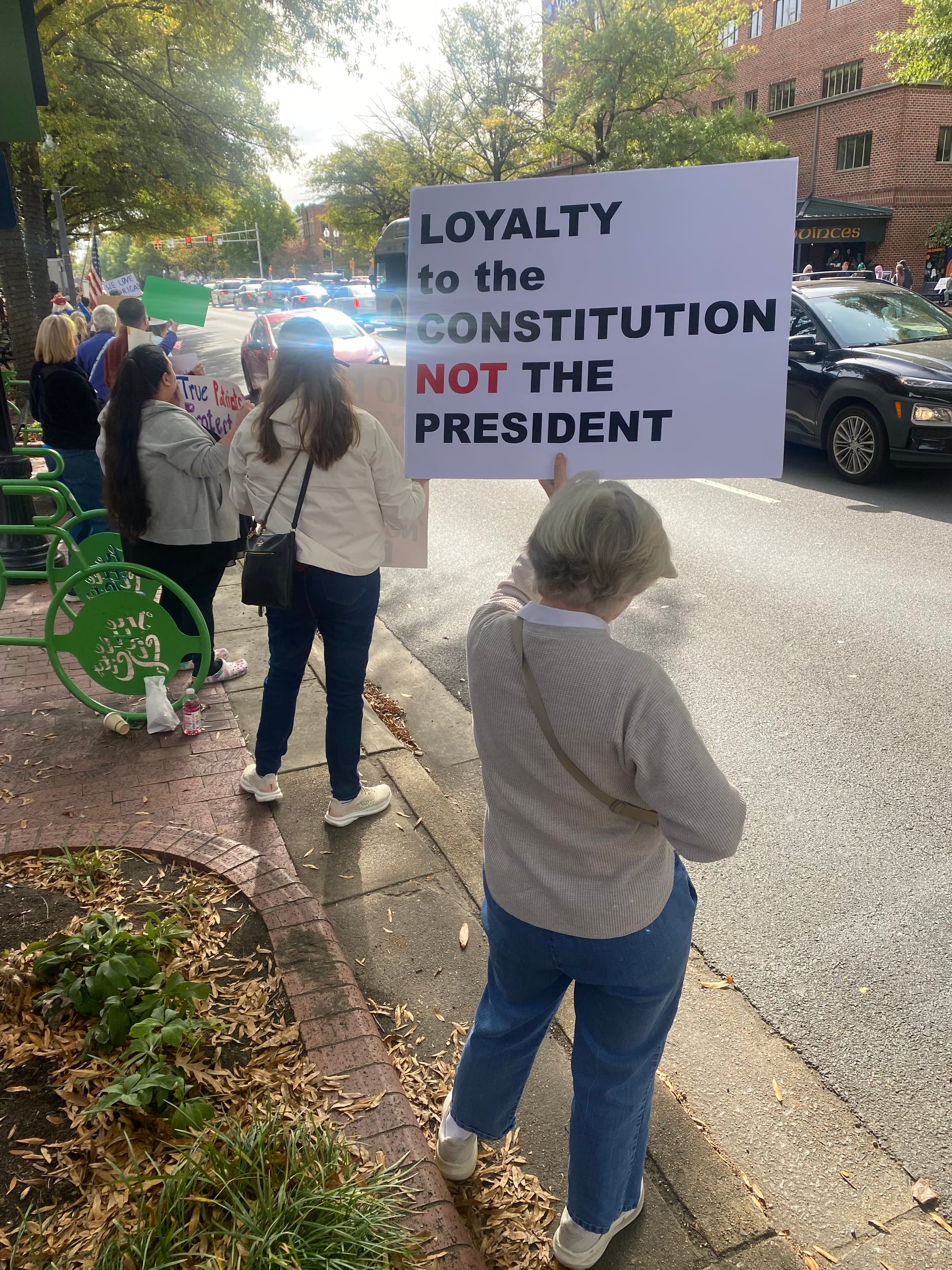 Finally, we encountered Anne Lancaster along Broad Street, carrying a sign saying, “Reject the Fascist Takeover” on one side and "We Shall Overcome" on the other. Interestingly, Lancaster’s deep Virginia roots extending to the founding of Jamestown in 1619 inform her constitutional principles. “My family is actually related to James Madison,” she said. And now, the Trump White House is just “running over all the court rulings and doing things that are just contrary to the Constitution,” Lancaster said.