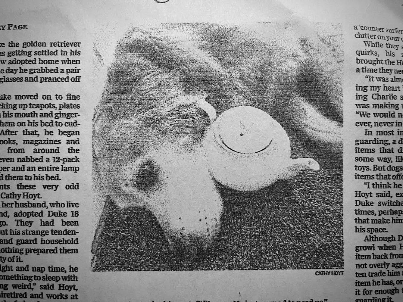 So, about this quirk: Duke employs “resource guarding behavior,” which means he becomes protective over items he values. But these aren’t typical dog toys or even small, fluffy teddy bears. These are large household items, some bigger than he is. He’s especially fond of teapots and dishes, but he’s also been known to cuddle with a lamp, a picture frame, or even a laundry basket. Mrs. Hoyt described him as a “counter surfer,” too, so that means no clutter up there. His former foster, a veteran of twelve other fostered pets, said, “He took my computer bag, with my computer in it and settled down with it for a nap on my sofa.”