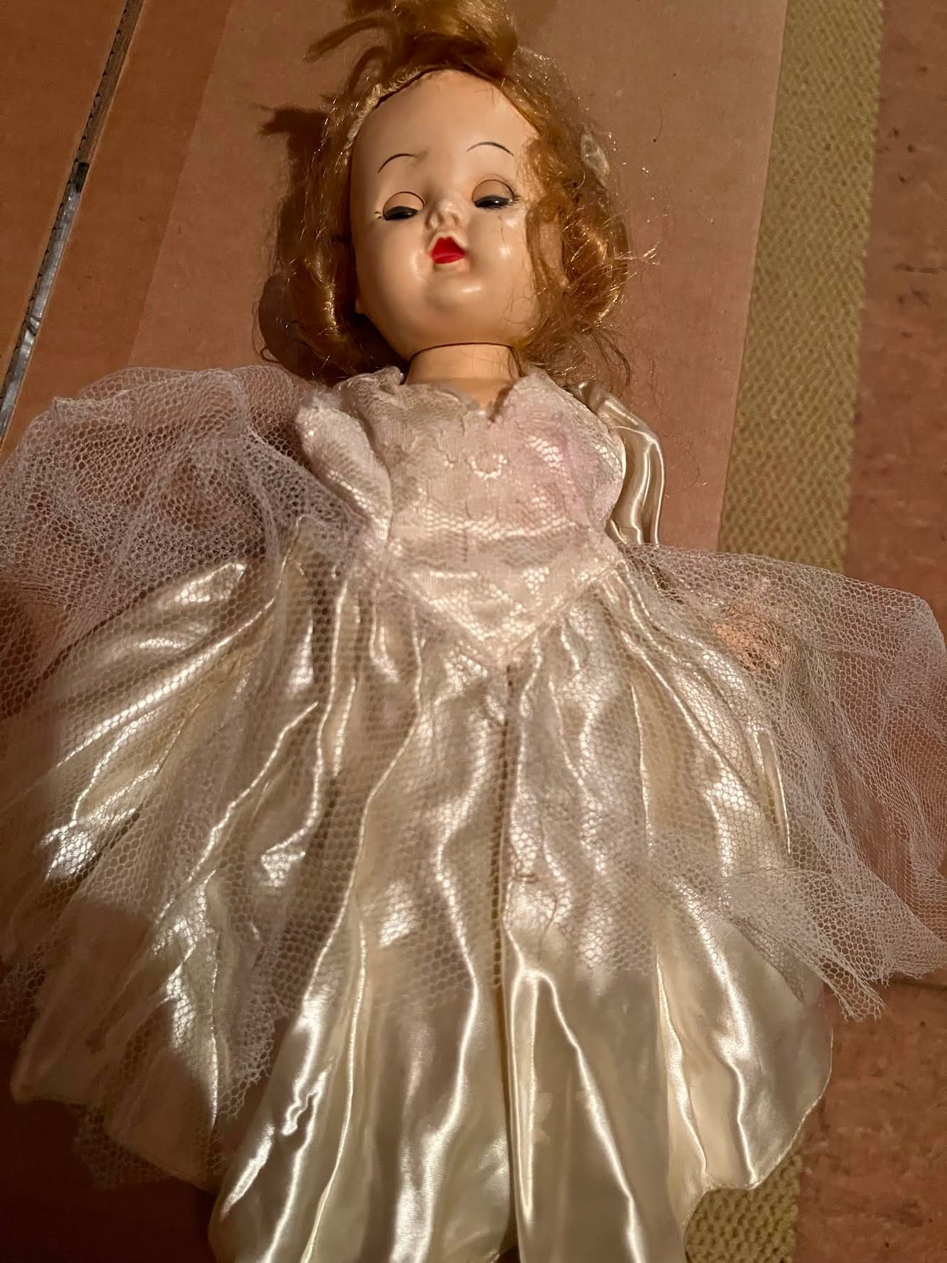 My favorite doll was the last one I received for Christmas, at age twelve. She was a Littlest Angel doll and came with a whopping wardrobe, thanks to my industrious mother. The girl had more clothes than Princess Kate. Some of her costumes were obviously purchased: her ice-skating dress with matching silver skates or her fringed cowboy outfit, complete with a felt cowboy hat, a holster with two little guns and cowboy boots. Mom must have spent weeks making additional clothes for her: sunsuits trimmed in small ric-rac with matching sunbonnets, a purple evening gown covered with pale green netting, and even the white satin wedding dress shown.