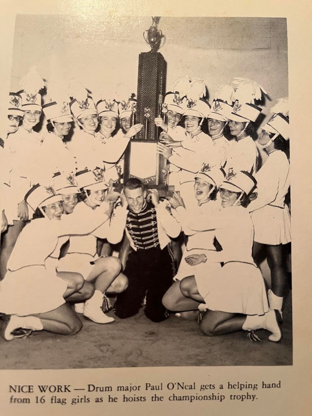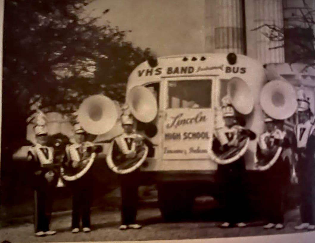This article made me think of my high school band, the Vincennes, Indiana, Alices, with 160 members, who won the Indiana State Championship in 1962. The picture shows the flag girls, my childhood pal among them, celebrating their win with the drum major. I was never a member of the band, but as an outsider, the band kids always seemed like a family to me, with Mr. Meurer, the director, as patriarch. I suppose they bonded over practice in the summertime heat or maybe while marching at football game half-times wearing those scratchy green uniforms with the white stripes down the sides. However successful the band was, their budget was tiny. Note the picture of the old school bus which hauled the instruments and the band members.