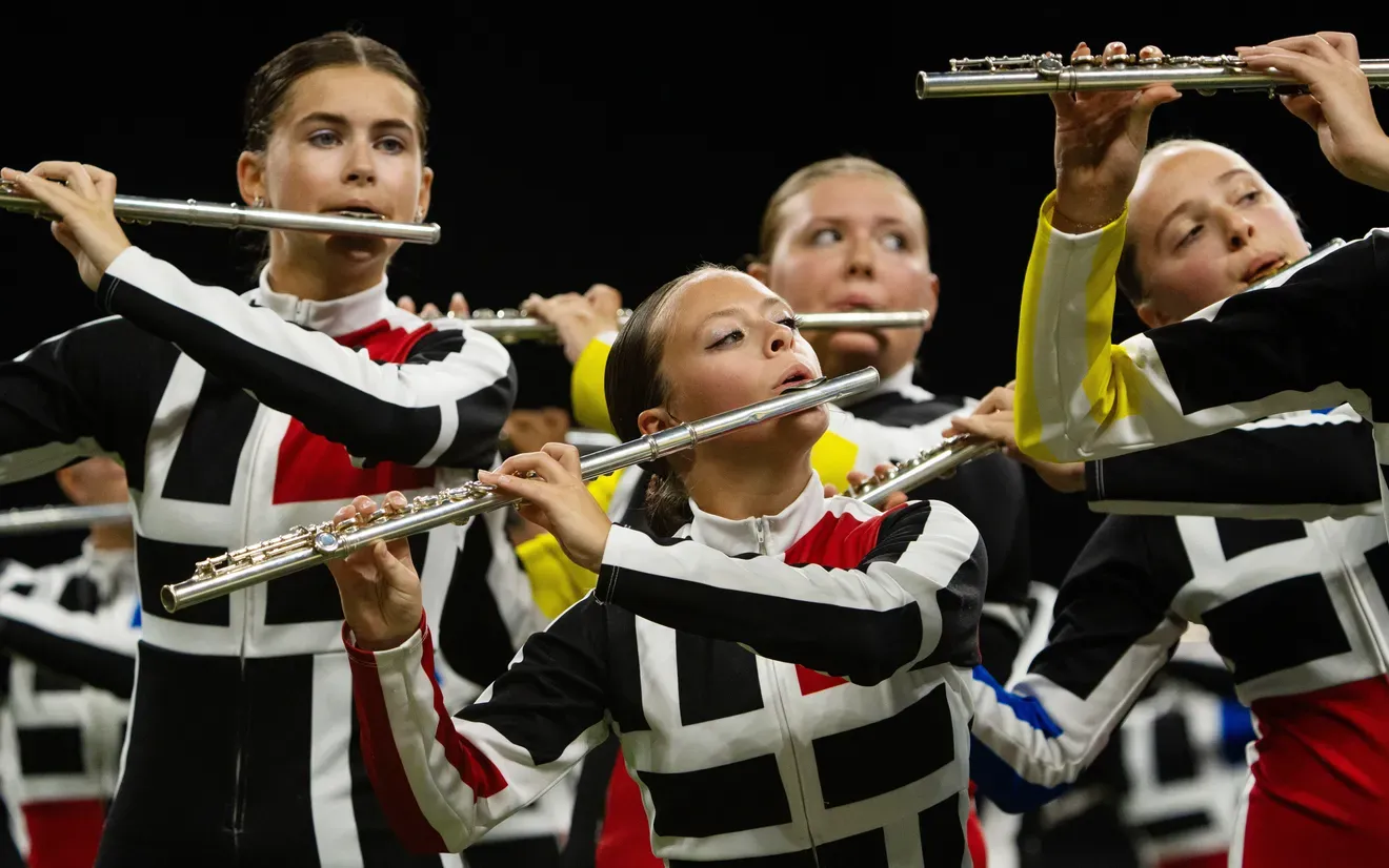 The nationally competitive bands no longer only play "Louie, Louie" at football game halftimes. Their programs are ambitious in marching patterns (think oblique angles, curves and clusters,) as well as musically, performing numbers like Bartok’s “Concerto for Orchestra.” That would be hard for high school musicians to perform sitting down, but they’re playing from memory while marching, dancing and crab-stepping sideways across the field. Two of the most competitive bands are only 25 miles apart in Indiana: the Avon High School Marching Black and Gold and the Carmel High School Marching Greyhounds. These two schools usually take turns winning the national competition, with 11 wins in the past 20 years. To keep their competitive edge, both schools now rely on music composers, drill designers and choreographers besides their Band Director. Some of the top schools have color guards of 50 girls.