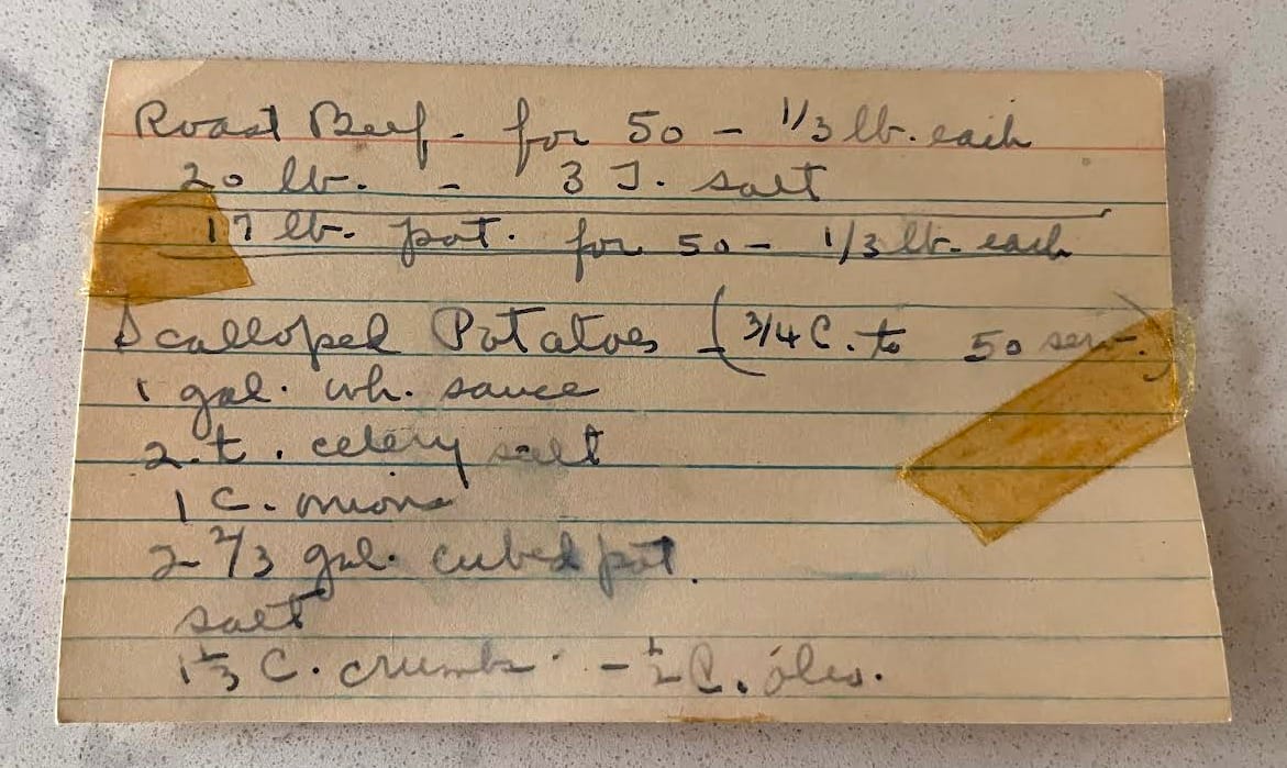 There were two varieties: a pot-luck and a one-entrée type. While I’ve been to both, I’ll focus on the one-entrée variety, put on by the North Methodist Church of Vincennes, Indiana, during the 1940’s and ‘50’s. Besides my fond memories, I know they happened, based on my mother’s recipe file entry shown below. I also found recipes for Chili for 75 folks and Chicken and Noodles for 150.