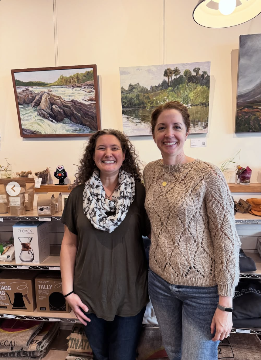 “Whenever I walk in, I think these would make great gifts, but it also makes me think of coffee, or tea, or just sitting down with a relaxing feeling. It’s part of the whole aesthetic,” I suggested. “I think that’s why we’re so drawn to coordinate with [Greenberg] and have her work here because it also [represents] us as well, right? We also want to encourage art, and we love coffee as well, and the combination of the two, it’s giving, and it’s community, and it’s very much intertwined.”