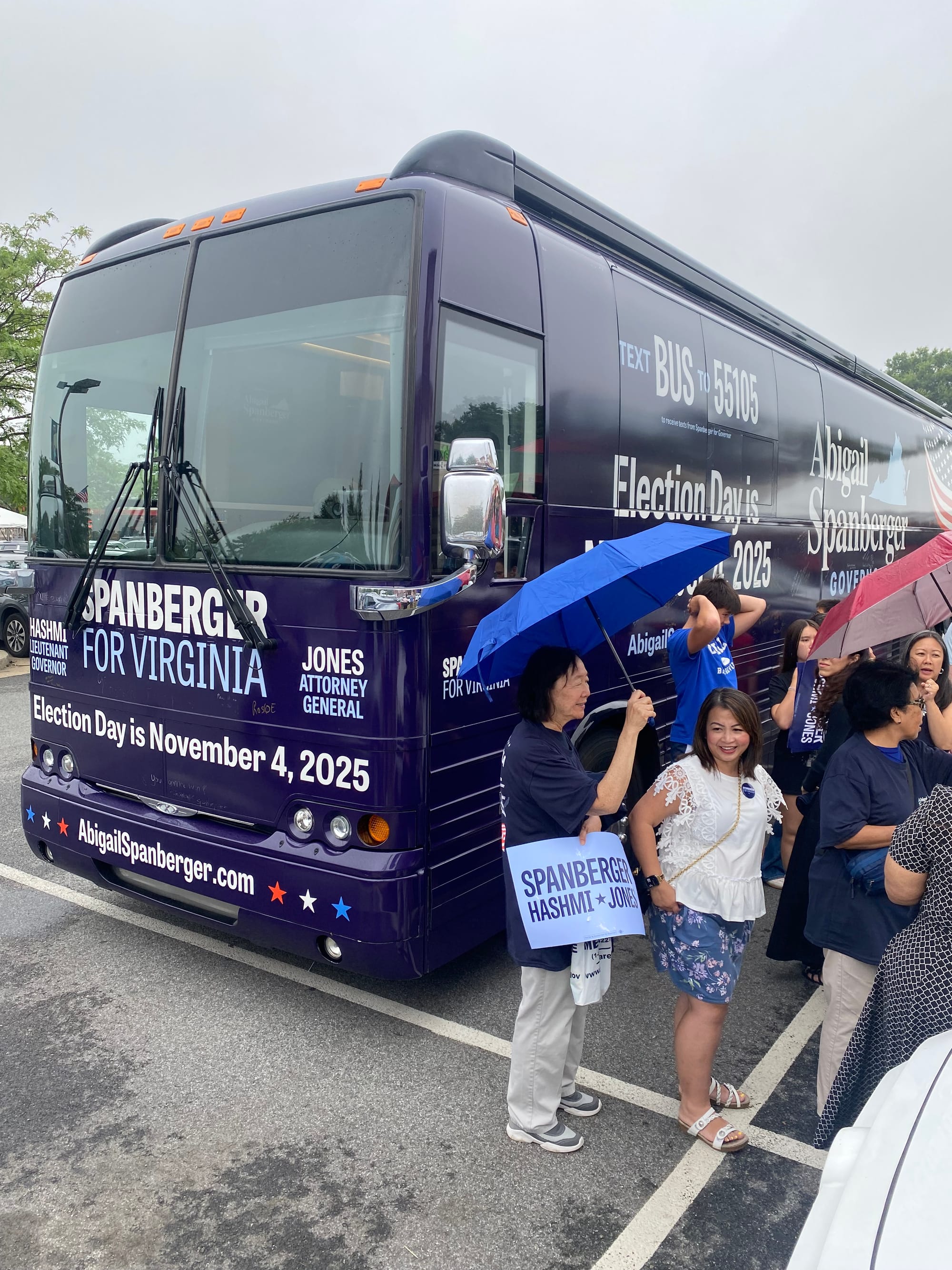 Stepping off the bus, the cheerful candidates appeared pumped-up for their first stop of the day, and seemed to enjoy campaigning as a trio dedicated to protecting Virginians who’ve been harmed by the “chaos and division coming out of Washington,” a clear messaging theme for their Eden Center tour, the first of several northern Virginia stops for the day.