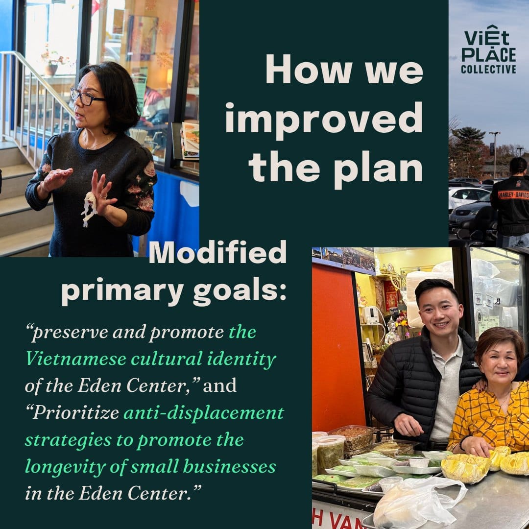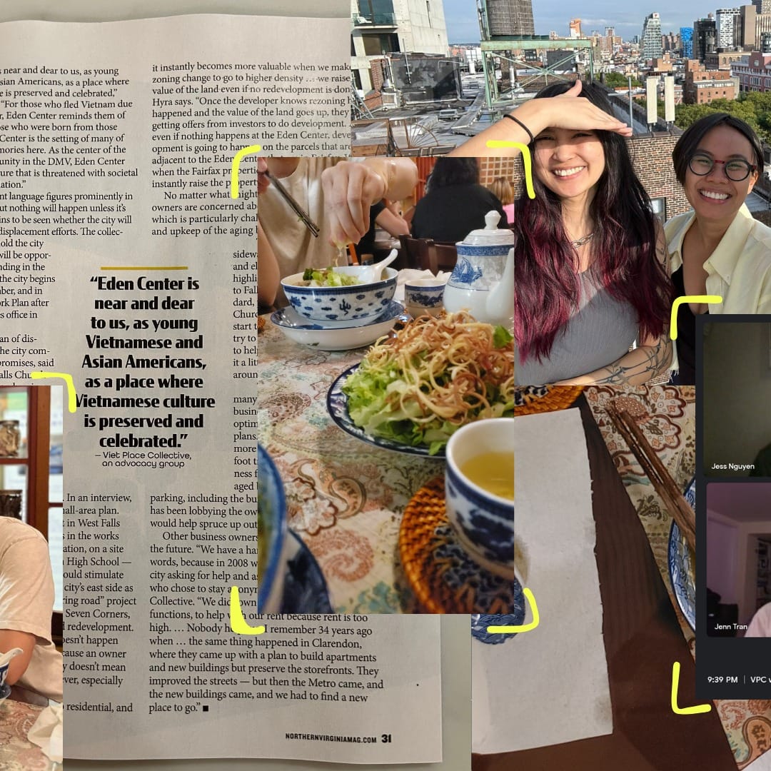 Before Quynh, Binh and other concerned Eden Center supporters named themselves the Viet Place Collective, they were simply an online chat group for anti-displacement and business/landlord concerns. “Well, it started as a group chat. We didn’t actually name ourselves until December 2022.... We did a lot of research ourselves to understand the City process, like, 'Why are they doing the Small Area Plan in the first place?,' 'How will it affect Eden?,' and doing outreach to those small businesses at Eden to ask if they know about these plans, to ask our community really broadly if they know about the consequences of development and what it has historically done to communities of color that have made a place vibrant.”
