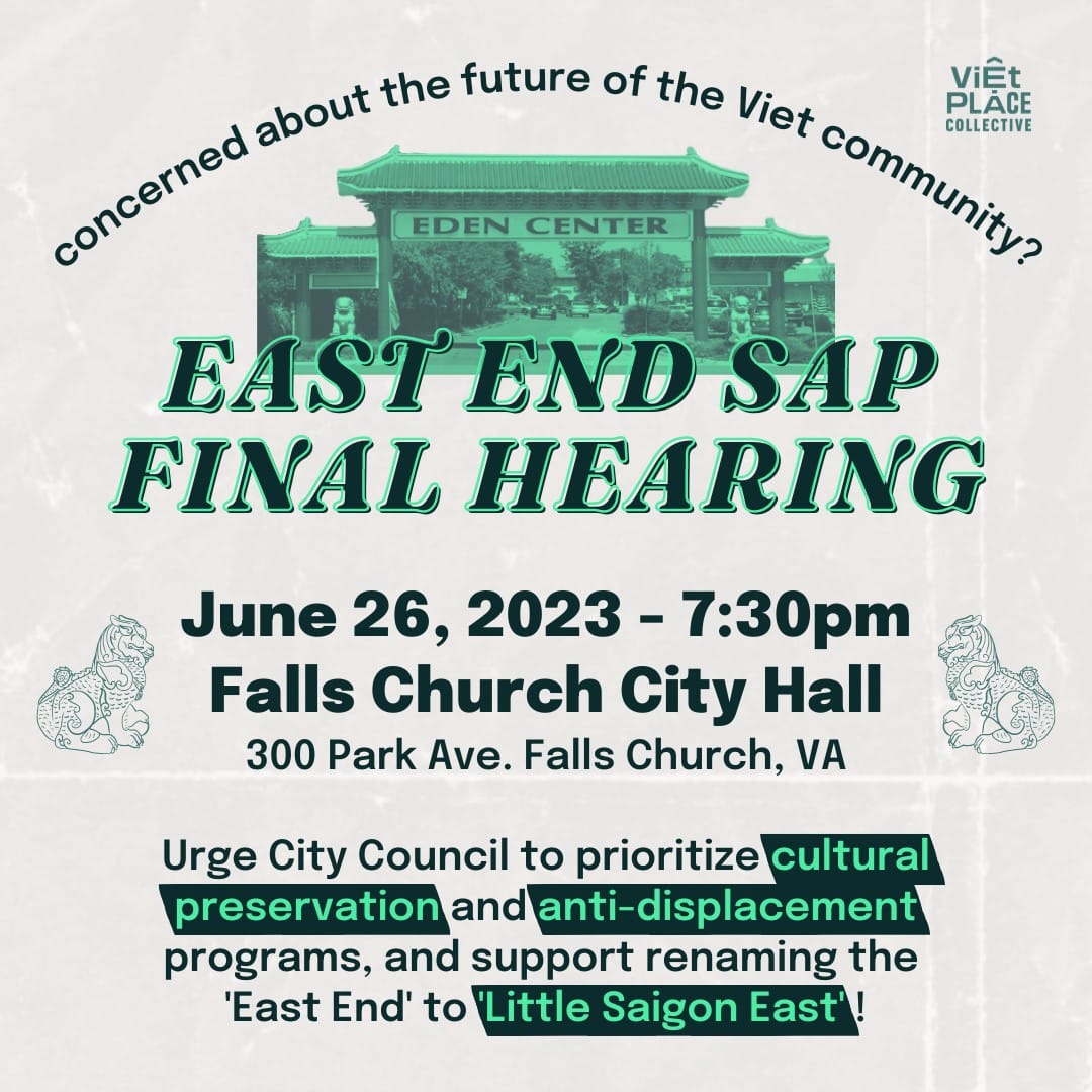 On their website, VPC could now translate their successful campaign to alter the City's East End SAP into greater credibility: "Viet Place Collective is an all-volunteer grassroots organization that aims to build power across generations to uplift and uphold the Vietnamese community's legacy in the DMV. VPC formed in Dec. 2022 in response to a redevelopment plan by the City of Falls Church over concerns about displacement of the majority-Vietnamese small businesses of Eden Center, the largest Vietnamese cultural and commercial hub on the East Coast and the cornerstone of our community in the region. We’ve championed the importance of preserving a cultural hub, recognizing the Vietnamese community's history of displacement as part of a greater trend of gentrification nationally. Within just a year, VPC's advocacy has improved conditions at Eden Center, brought Vietnamese voices and an anti-displacement toolkit to the City’s plan, and raised the City's standard for equitable outreach to impacted populations."