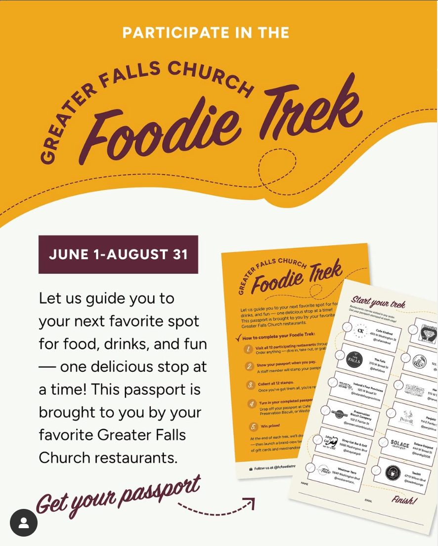 "The Food Trek features 12 diverse and celebrated local restaurants, including Borek G, Cafe Kindred, Ellie Bird, Harvey’s, Panjshir, TeaDM, and more. Participants can pick up a Food Trek passport at any participating location starting June 1, collect stamps at each spot, and turn in completed passports for a chance to win one of three prize baskets filled with gift cards and goodies from some of Falls Church’s favorite spots."