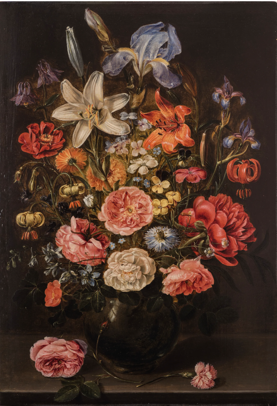 *Bet you can't find this crazy piece of art: A Still Life of Lilies, Roses, Iris, Pansies, Columbine, Love-in-a-Mist, Larkspur and Other Flowers in a Glass Vase on a Table Top, Flanked by a Rose and a Carnation !
